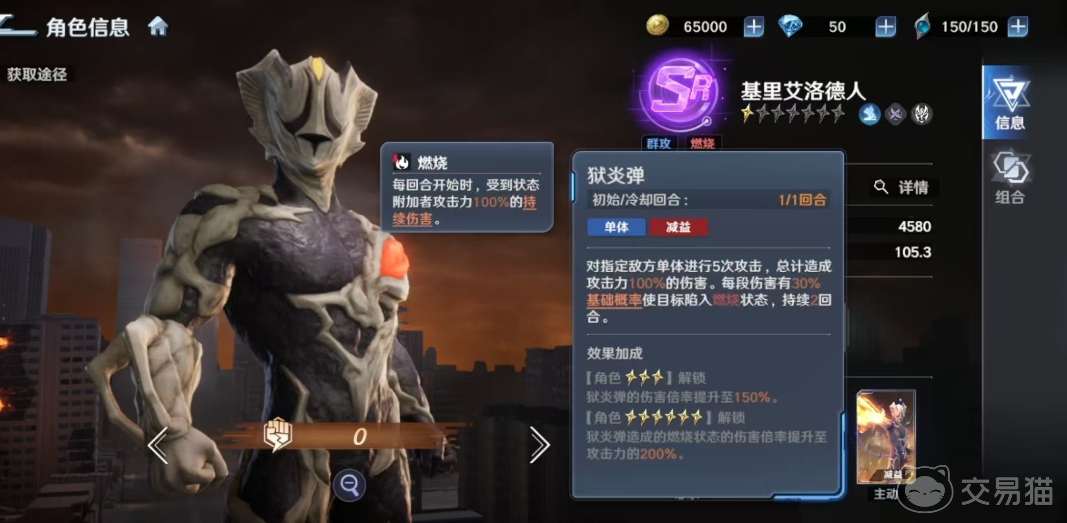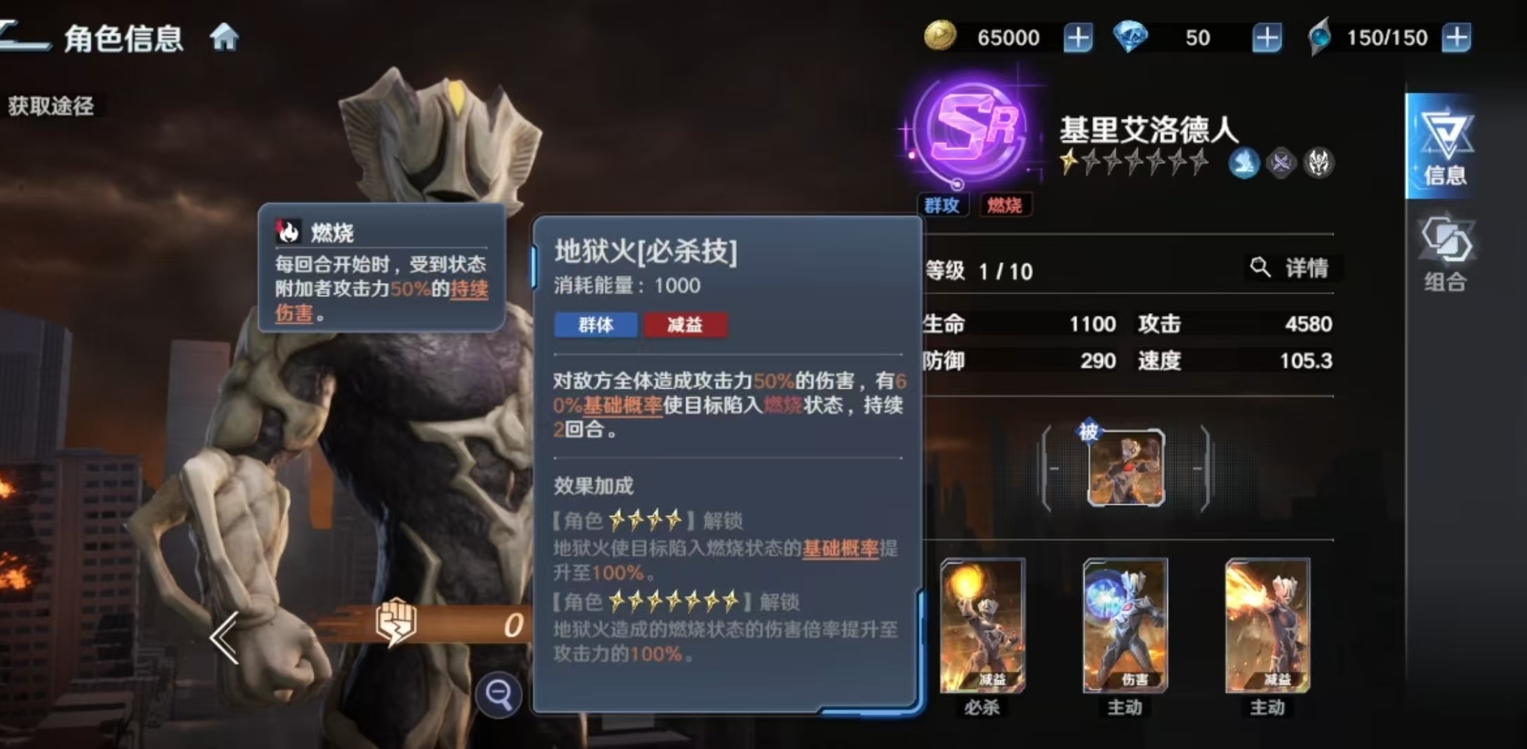 基里艾洛德人的战术定位清晰:以群体异常状态施加为核心,辅以稳定持续伤害。其被动技能在战斗开始时即提升自身效果命中率20%,显著强化燃烧状态的触发稳定性。而燃烧作为游戏中关键的异常状态之一,具备明确的数值规则:每回合初对目标造成等同于施放者50%攻击力的固定伤害,且可叠加作用于全体敌方单位。