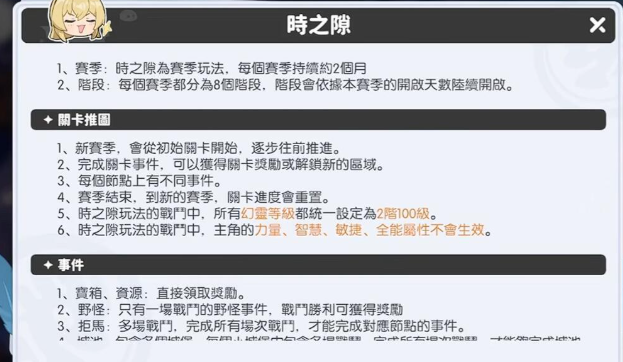 “时之隙”为赛季制独立副本,每赛季持续两个月,共划分为8个阶段,随开服天数逐步解锁。赛季开启后,玩家需从初始关卡重新挑战,完成各类事件以获取资源奖励——包括宝箱类资源事件与野怪遭遇事件等。需特别注意:赛季结束后,所有关卡进度将被重置;且该玩法中所有幻灵等级统一设定为2100级,确保公平竞技与策略比拼的基础一致性。