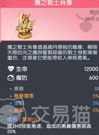 鹰之战士金像:侧重于战局稳定性与反打潜力的多功能饰品。提供12,000点生命值与600点魔法防御,在团战高压力环境下显著延长生存窗口;10点暴击、5%法术攻击、5%暴击伤害构成三维输出强化结构;3%生命值加成则进一步扩大残血操作空间,使低血量状态下仍保有技能反制与收割能力。该装备在推进节奏与阵地战中均能发挥实质性战术价值。
