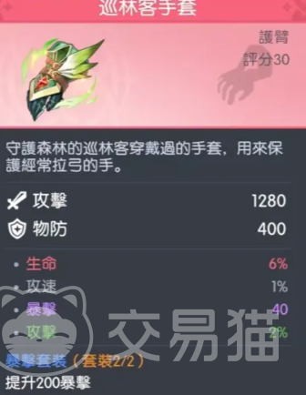 巡林客手套:虽外观偏重物理职业定位,但实际适配洛基具备突出协同性。基础属性含1280点法术攻击,进一步夯实输出基数;400点物理防御有效缓解法师身板薄弱的问题;6%生命值加成提升容错空间,降低被突进型敌人秒杀的风险;1%攻击速度虽数值不高,却能优化普攻与技能间的衔接流畅度,强化输出节奏感。套装效果尤为关键——两件套激活后提供200点暴击属性及额外暴击率加成,大幅增强关键技能的命中反馈效率。