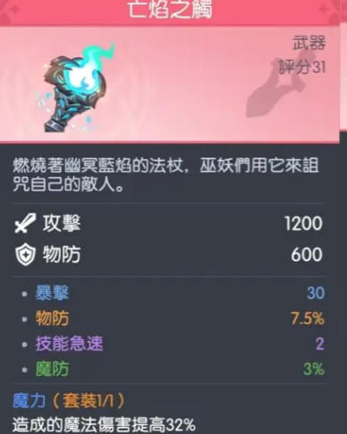 亡焰之触:该装备是当前版本法师向毕业级选择之一。提供1200点法术攻击加成,同步赋予3%魔法防御与7.5%物理防御,显著改善法师面对混合伤害环境时的基础承伤能力。30点暴击属性可有效支撑灼烧、诅咒类持续伤害效果的触发频率;其核心价值在于32%的全魔法伤害提升,相当于为所有技能施加稳定增益,是输出构筑的核心支点。