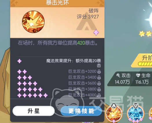 核心解法在于“暴击光环”类增益。实测表明,选用为全队提供420点暴击的龙语光环后,该数值将100%叠加至折算后的暴击率之上,即55.7% + 42% = 97.7%。此状态下,绝大多数攻击均可触发暴击,紫色暴击数字高频浮现,实战中几乎无空爆记录。此外,龙语升阶后还可额外解锁20点暴击,虽增幅有限,却恰好补足最后临界缺口,实现理论最大稳定暴击阈值。配合其自身15.09万物理攻击力与107.2万生命值,荆兼具生存韧性与瞬时杀伤力;再协同制裁重锤(提升40%攻击力)与镇魂曲(降低目标受治疗效果),整套体系形成攻防闭环。
