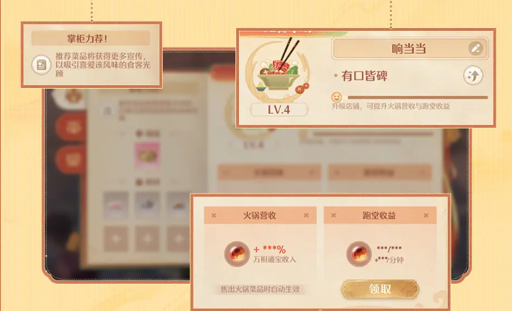 支持设置专属招牌菜,并更换店内展示的主推锅底样式,以此吸引偏好该风味的顾客群体;提升店铺等级可直接增强收益能力;经营手册中清晰列明各项升级带来的盈利增幅效果。
