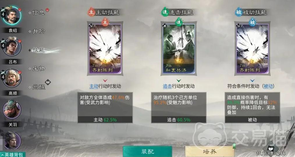 袁绍:主动与被动均配置“齐射阵列”,最大化压低敌方血线;被动补充“和衷共济”,提供概率性减防与随机三单位治疗,在维持输出节奏的同时兼顾队伍生存。