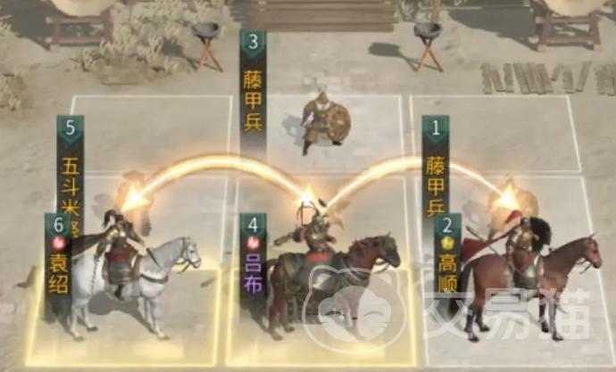 站位采用三排纵深布局:高顺、吕布、袁绍全部置于第三排。此举规避当前版本多数AOE与锁定技对中排/上排的优先打击逻辑,虽略微延后吕布出手时机,但极大保障了核心输出单位的存活率——只要吕布与袁绍不被集火秒杀,队伍即可维持稳定输出循环。