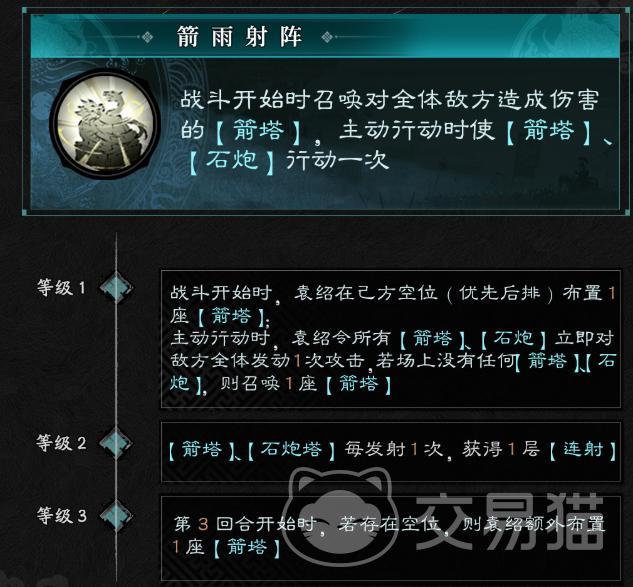 袁绍:体系驱动者。天赋“箭雨射阵”可在开局于己方空位部署箭塔,每个大回合开始对敌方全体造成范围伤害,且伤害数值受统率属性影响。其主动行动可使所有箭塔与石炮额外执行一次攻击;叠加“连射”效果后,中后期召唤物输出量呈阶梯式增长。觉醒技“高橹连营”可随机将一座箭塔升级为满兵力石炮,触发火焰溅射(范围伤害)、散砾易伤(群体减防)、巨石眩晕(高倍率单体控制)三重效果,在关键回合打乱敌方行动序列,奠定拉锯战优势。