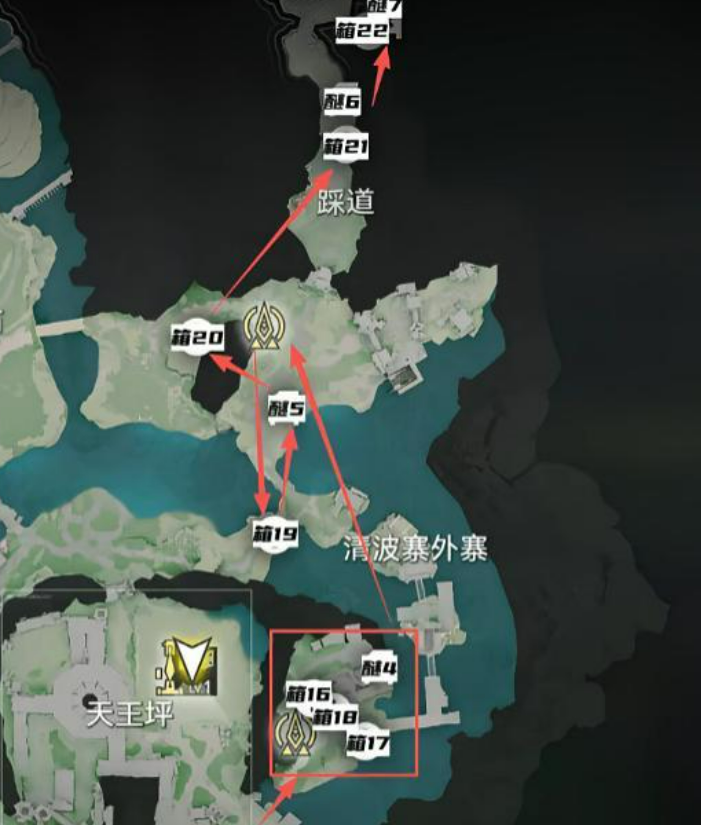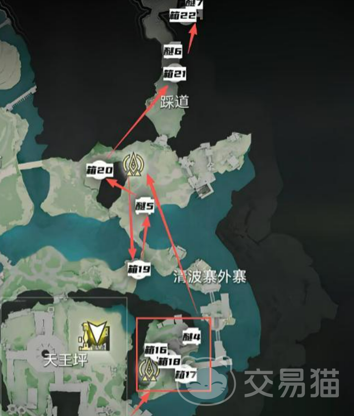 天王坪右上角区域资源密集度较高,共含醚质7处、宝箱22个。该片区地形开阔但细节丰富,推荐启用鹰眼模式逐层扫描,避免因视角遮挡遗漏角落点位。