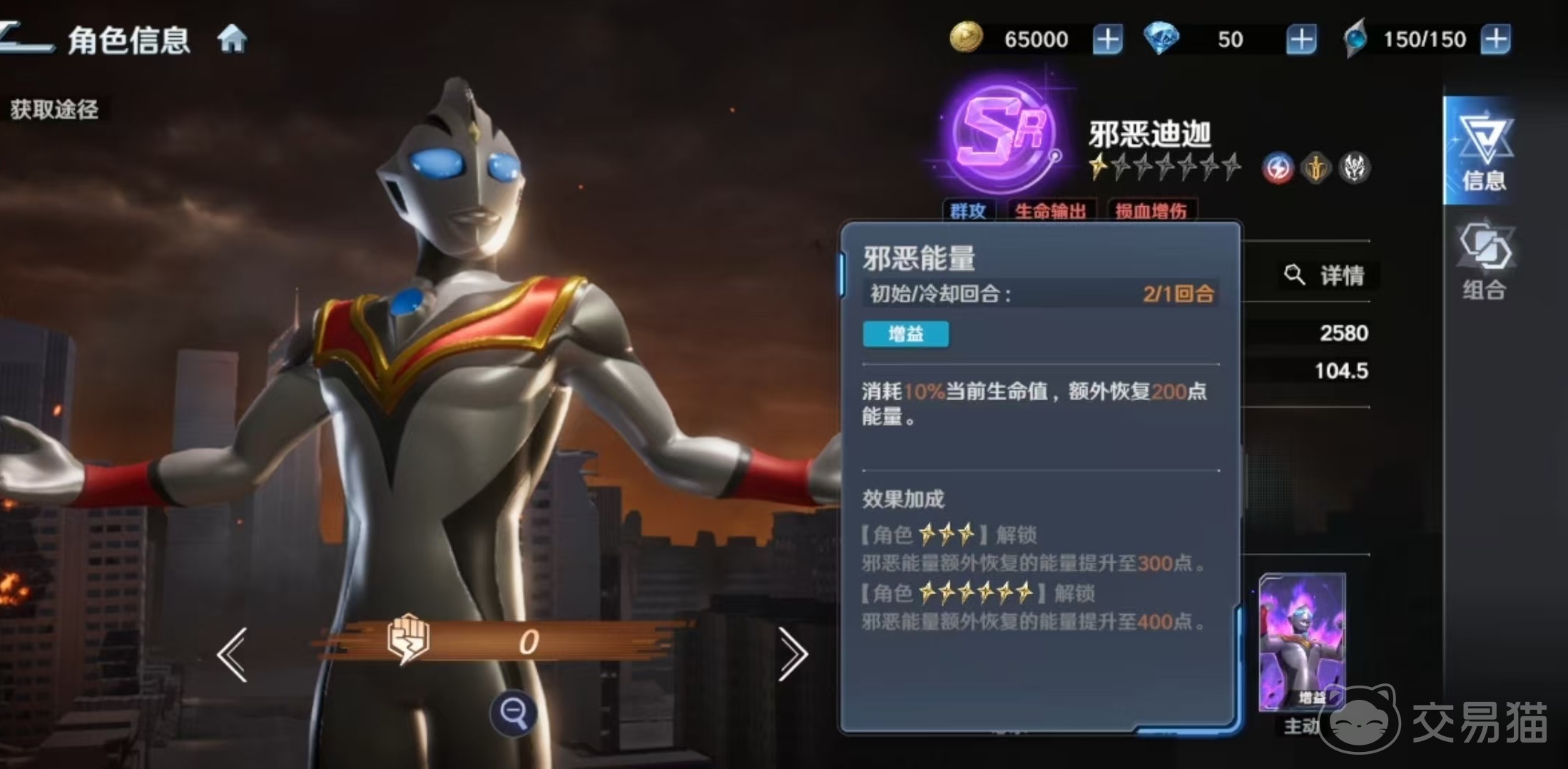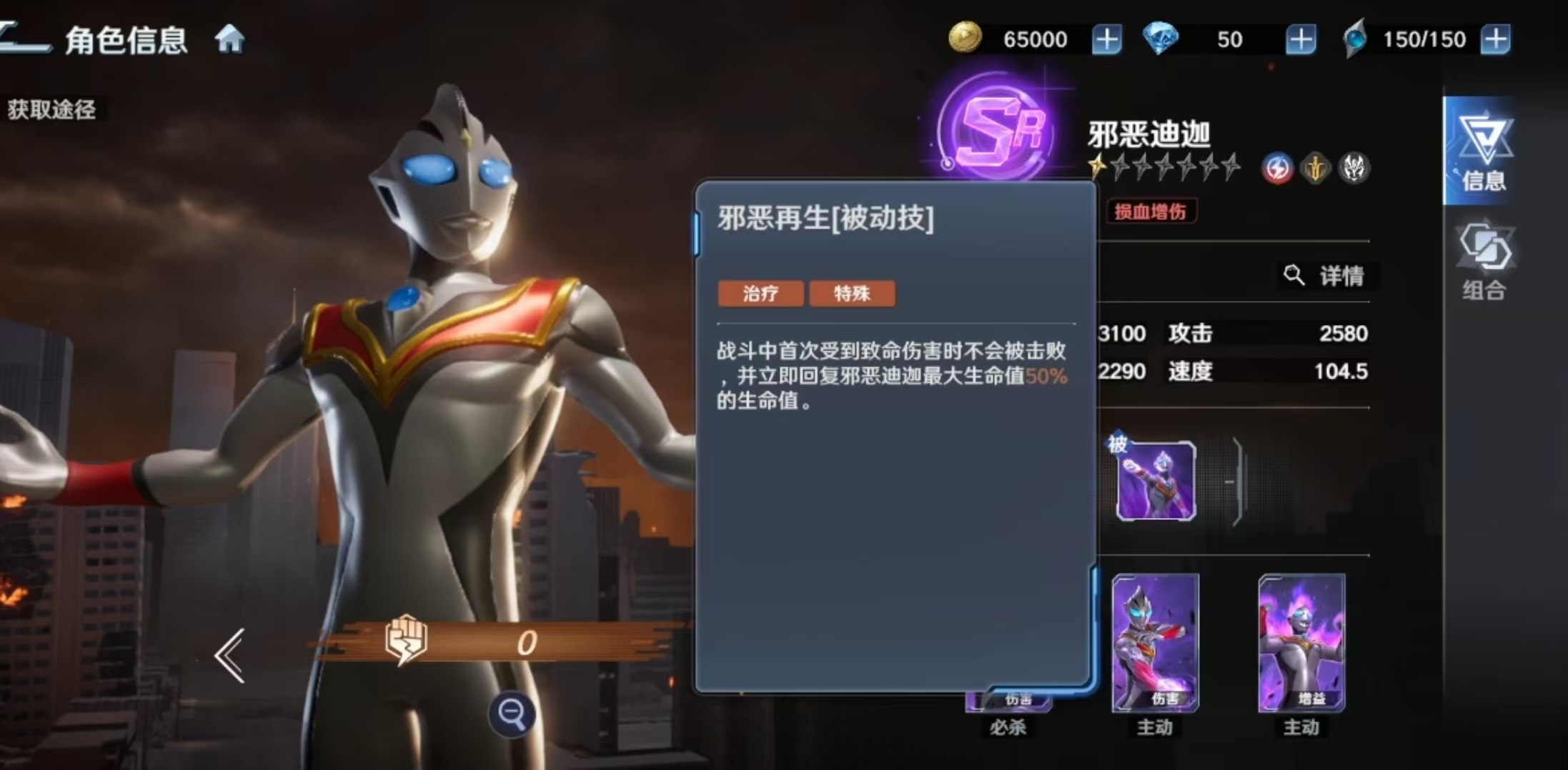 邪恶迪迦定位为SR稀有度角色,属于典型的高成长性前期主力。虽然品级限制了其在中后期顶级副本中的持续竞争力,但其技能体系高度适配开荒节奏:具备稳定的群体伤害能力,并通过“损失生命值提升输出”这一核心机制形成差异化优势。在资源有限的初期阶段,他能高效完成主线关卡与日常任务,是过渡阵容中值得优先投入培养的对象。