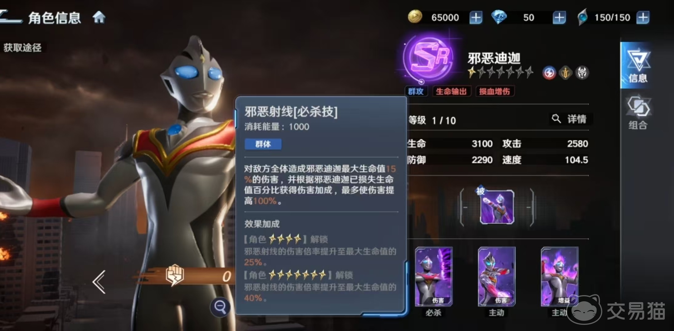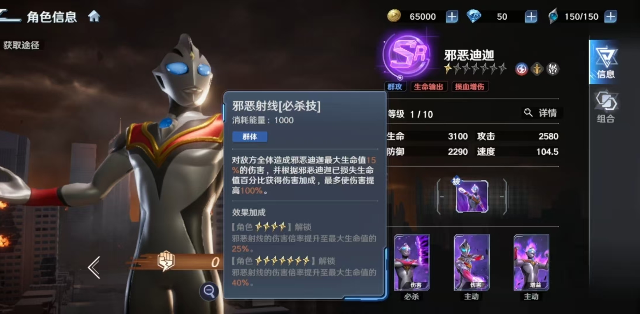 主动技能“邪恶光线”消耗当前生命值的10%,对单体目标造成15%最大生命值伤害;随星级提升,该技能倍率可逐步强化至40%。该设定使其在低星阶段表现平庸,但养成到位后具备可观的点杀能力。另一项主动技能“邪恶能量”同样消耗10%当前生命值,可额外恢复200点能量,满星状态下恢复量提升至400点,有效缓解能量循环压力。综合来看,邪恶迪迦属于典型的“养成驱动型”角色:SR稀有度降低了获取与突破门槛,而技能机制又要求一定星级支撑才能释放全部潜力。