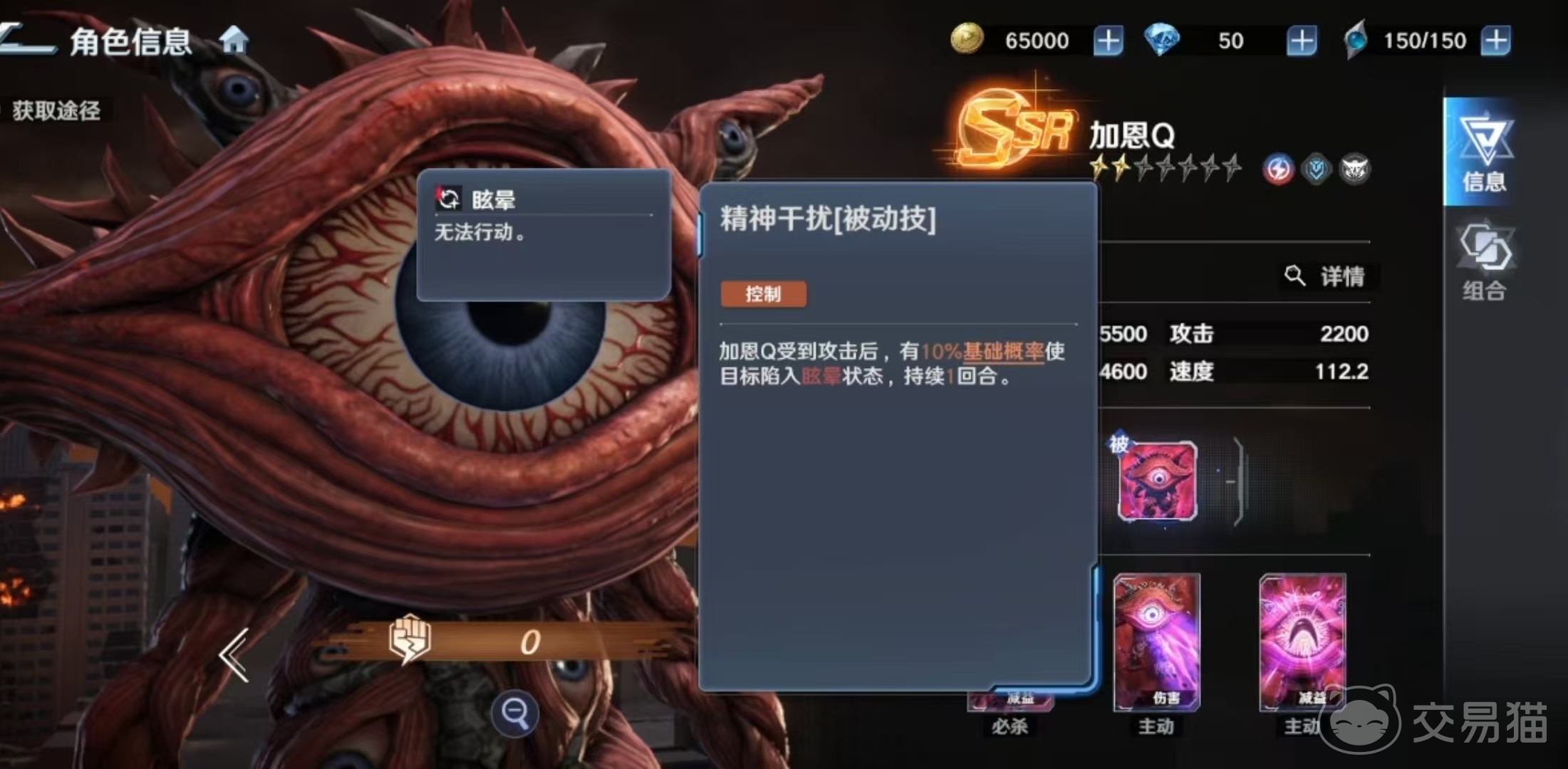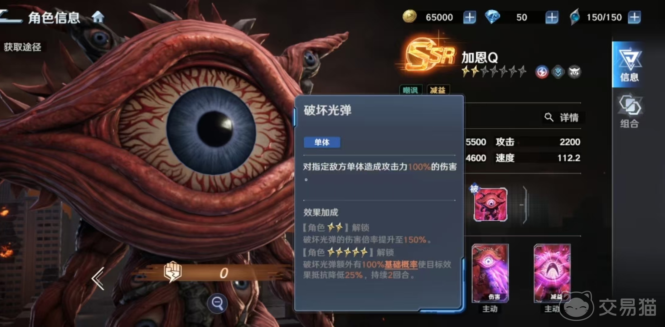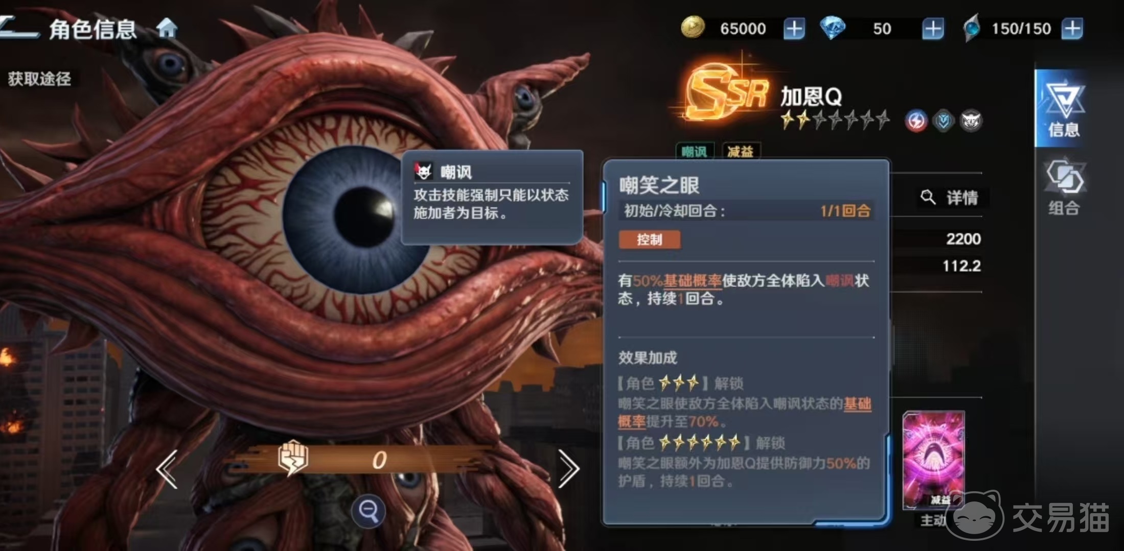 其必杀技“吸收光线”为单体高伤技能,命中后附带迷茫状态,使目标跳过下回合行动,并额外承受等同于自身攻击力100%的真实伤害。该效果兼具强控场与爆发补伤双重价值,但受限于单体范围与概率触发机制,实战容错率需结合队伍配置综合评估。主动技能“破坏光弹”除造成基础单体伤害外,可降低目标效果抵抗属性,有效提升团队各类控制与减益技能的命中效率。终极技能“嘲笑之眼”可对敌方全体施加1回合嘲讽,随着星级提升,该技能触发概率最高可达70%,同时为加恩Q自身附加护盾,显著增强其生存能力与技能释放频率。