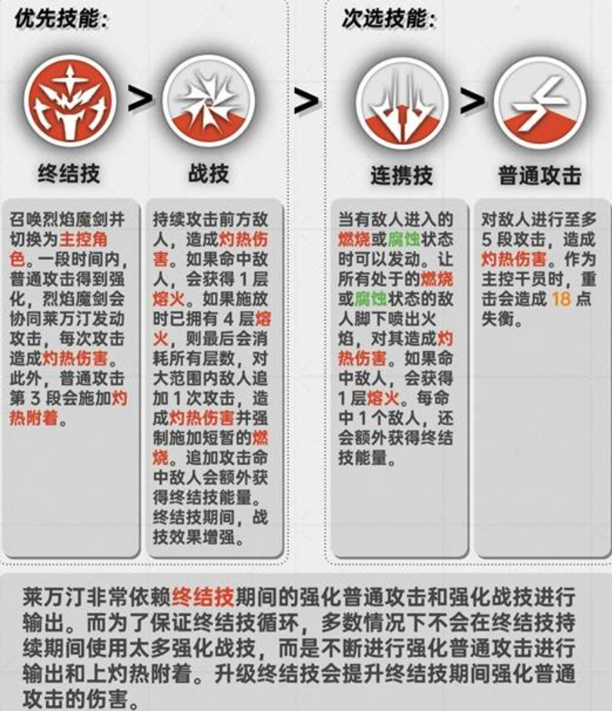 莱万汀的核心机制围绕“熔火层数”构建:其普通攻击与重击可对目标施加灼热附着,并逐层叠加;当主动消耗已积累的熔火层数释放战斗技能时,将触发额外伤害加成。此外,战斗技能与连携技能均具备加速终结技能充能的效果。而其终结技能作为关键爆发手段,开启后不仅大幅提升普攻倍率,还可对大范围敌人造成高额斩杀伤害,兼具AOE清场与单体压制能力。