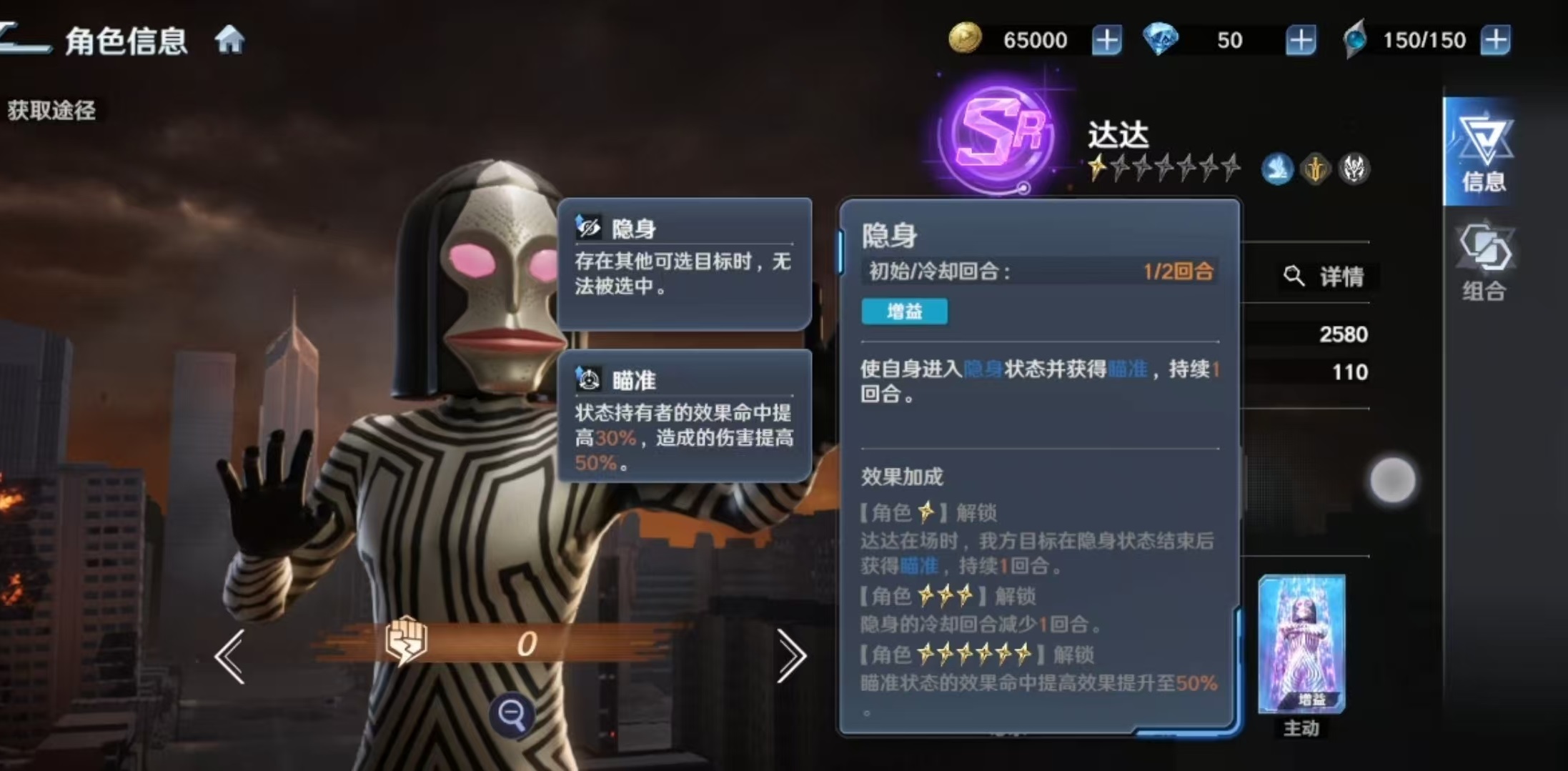 达达的核心机制围绕“隐身—瞄准—单体压制”三重逻辑构建。其被动技能【突袭】可在己方单位结束隐身状态后,赋予其“瞄准”效果:提升30%效果命中率与50%伤害输出,持续一回合。该设定使其成为隐身系阵容的关键衔接者,尤其适配强调状态链触发的战术体系。