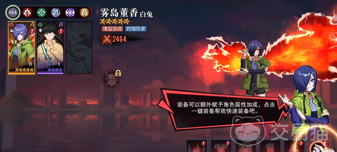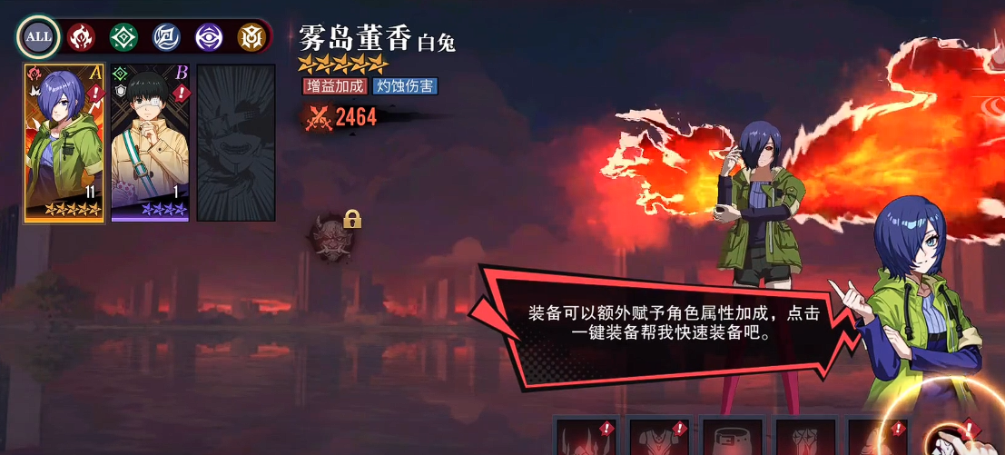 首位推荐的是主角金木研。其机制设计兼具持续作战与爆发节奏:被动技能可在每次造成伤害时按比例吸取敌方生命值,形成稳定续航;普攻与小技能具备全场范围伤害能力,大招则触发“强化状态”,使后续所有攻击附加额外百分比真实伤害。该角色无明显机制短板,成型后对单体与群体场景均有出色压制力,是开荒期最值得优先投入资源培养的核心输出单位。
