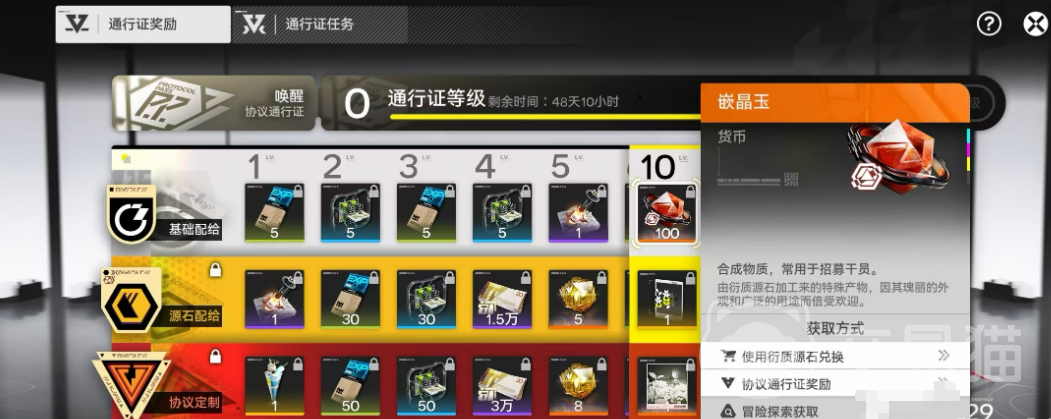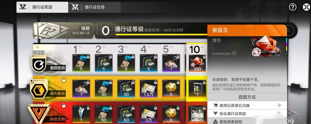 协议通行证提供长期稳定收益。基础档位售价68元,激活后随通行证等级提升自动发放嵌晶玉奖励。等级成长依赖日常任务、探索进度及活动参与度,无需额外付费;满级累计可获超3000枚嵌晶玉,单日平均收益显著高于纯充值方案。
