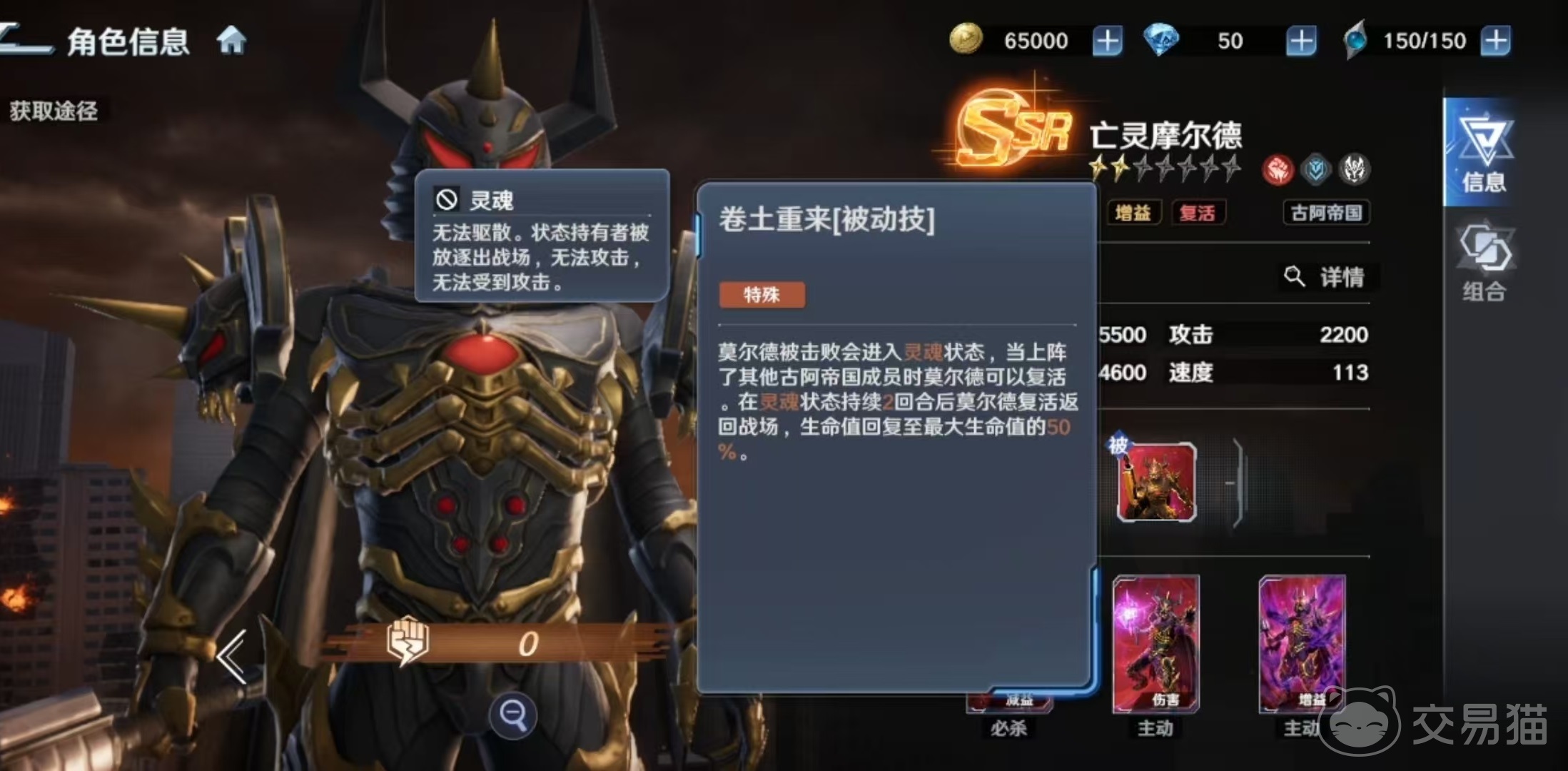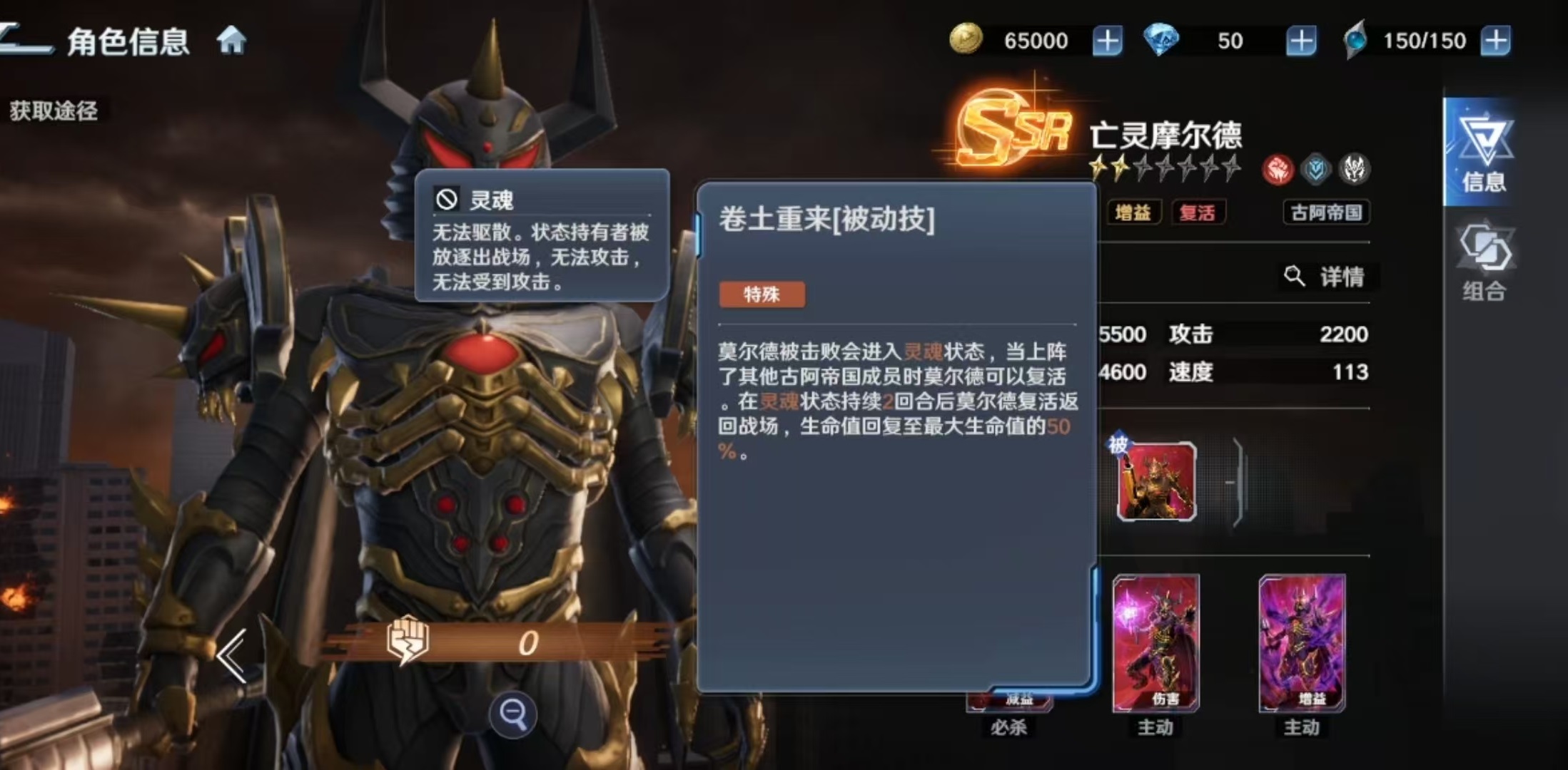 亡灵摩尔德隶属古阿帝国阵营,具备三重战术功能:强制敌方目标转向自身(嘲讽)、承受队友所受部分伤害(链接分摊)、以及战败后限时返场(被动复活)。其被动“卷土重来”明确限定触发条件——仅当场上存在至少一名其他古阿帝国单位时生效;成功触发后,摩尔德将在两回合后重返战场,并恢复至50%最大生命值。该机制决定了其无法单兵作战,必须搭配同阵营角色才能发挥完整效能。