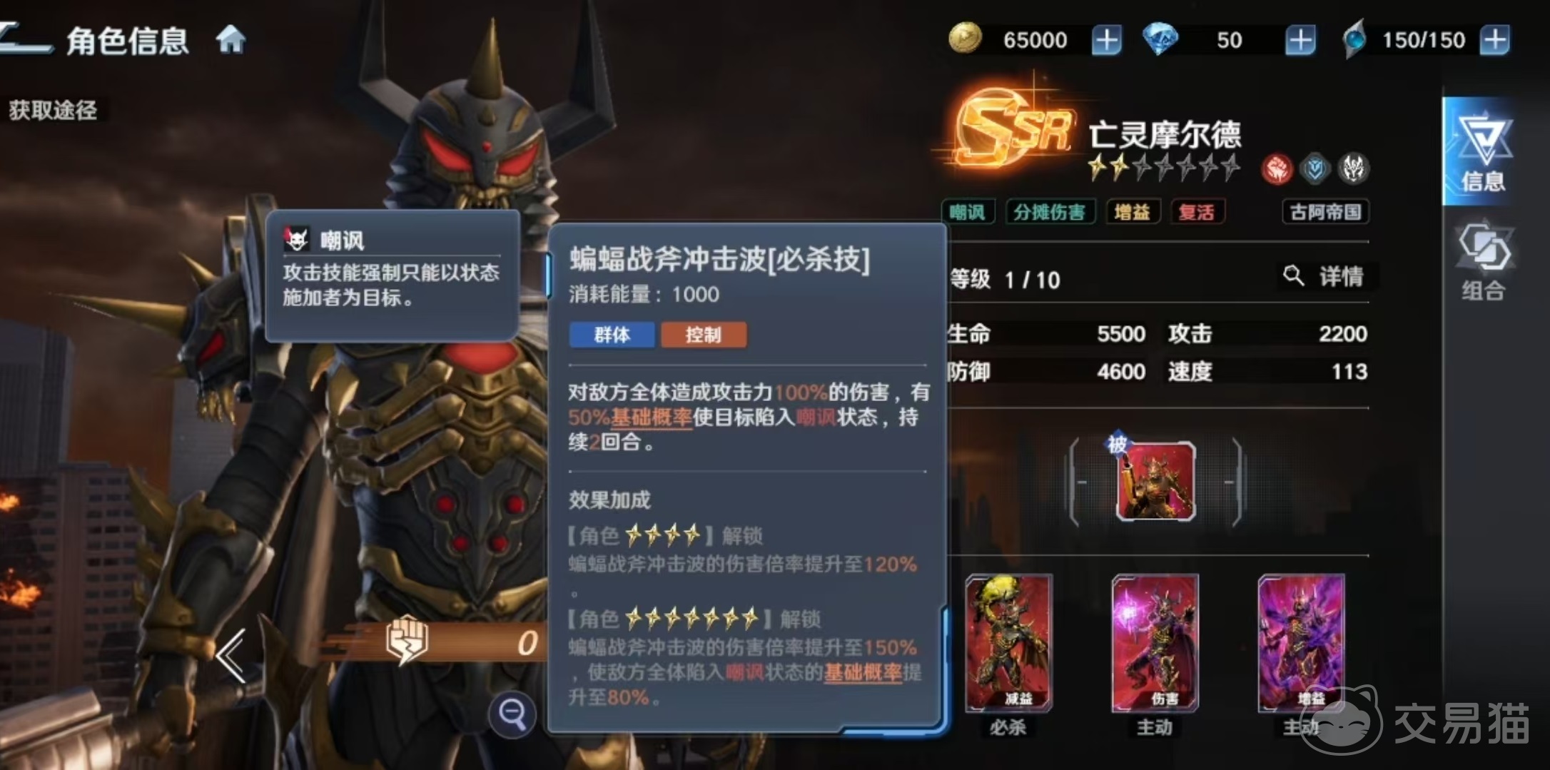 必杀技“蝙蝠战斧冲击波”为群体伤害技能,基础效果含概率施加两回合嘲讽,使被命中单位强制以摩尔德为唯一攻击目标,从而保护我方脆皮输出或辅助单位。星级提升可同步增强伤害倍率与嘲讽触发率。单体技能“念力飞斧”采用多段打击形式,对指定敌人造成多次独立结算的伤害。辅助技能“暗黑恩赐”提供全体防御增益,若受加持者同属古阿帝国,则额外激活“链接”状态——该状态下,链接单位所受伤害将按比例转移至摩尔德承担,形成实质性的伤害缓冲网络。