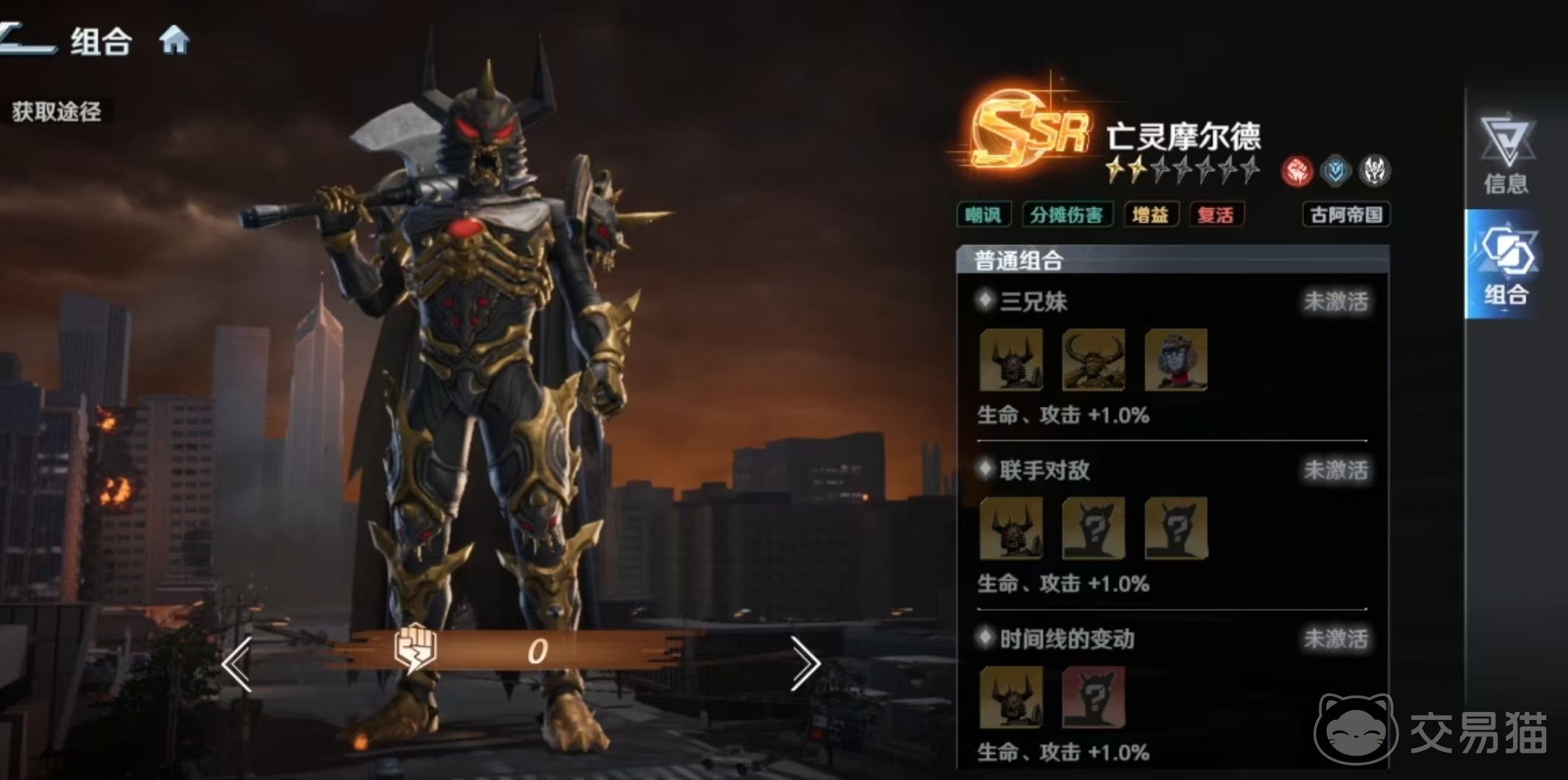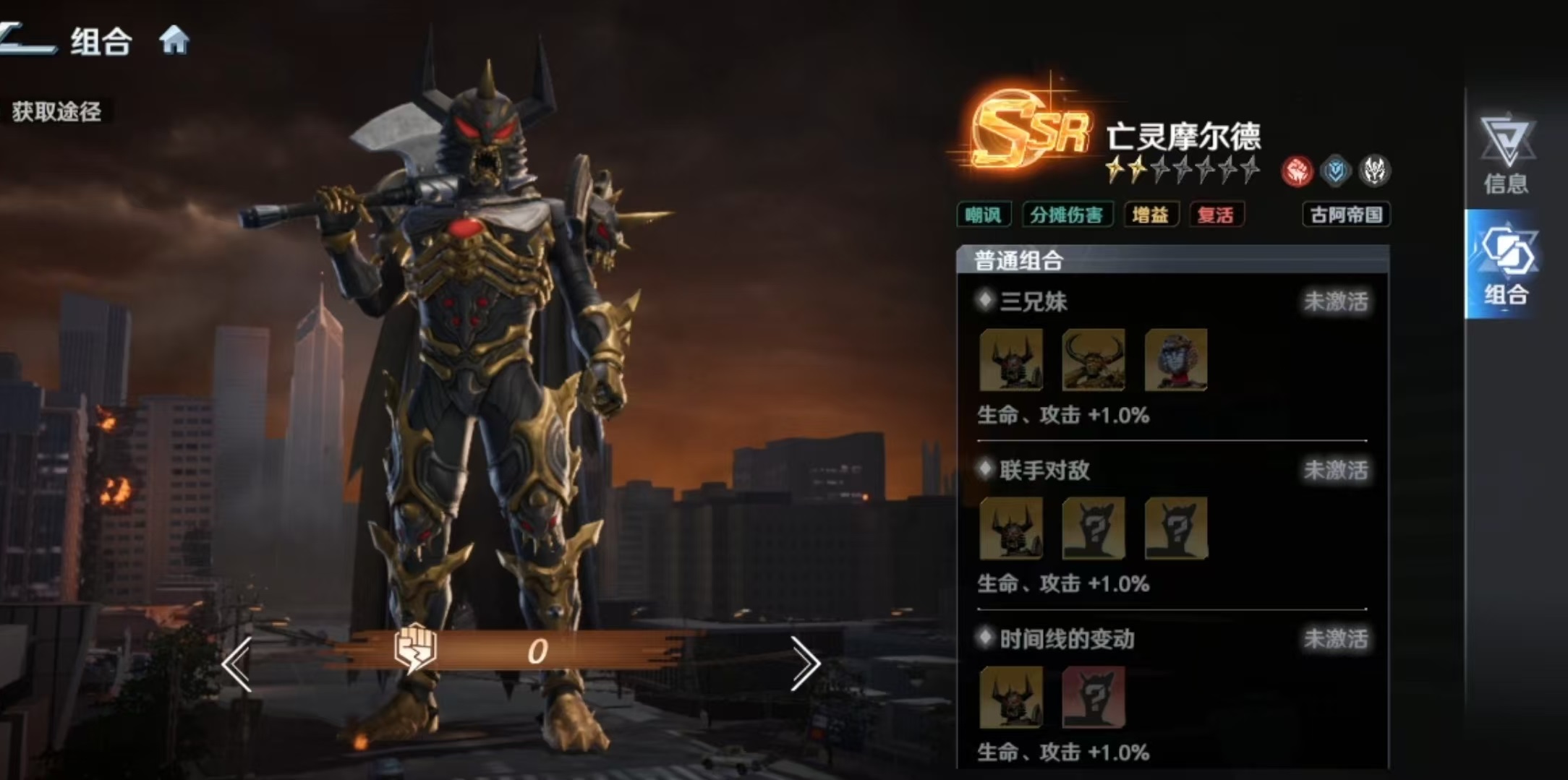 基于上述机制,最优阵容构建逻辑清晰:以古阿帝国为核心闭环。典型配置包括亡灵裘达、亡灵基纳、亡灵摩尔德组成的“三兄妹”组合,辅以黑暗扎吉与芝顿。三兄妹共享“卷土重来”被动,彼此互为复活触发条件,大幅提升队伍容错率与持续作战能力;黑暗扎吉承担主力输出并叠加负面状态,芝顿则补足范围伤害与控制维度,整体形成高生存、强压制、可持续的怪兽系战术体系。