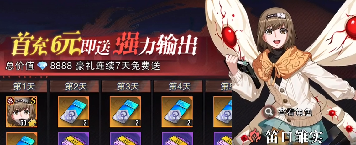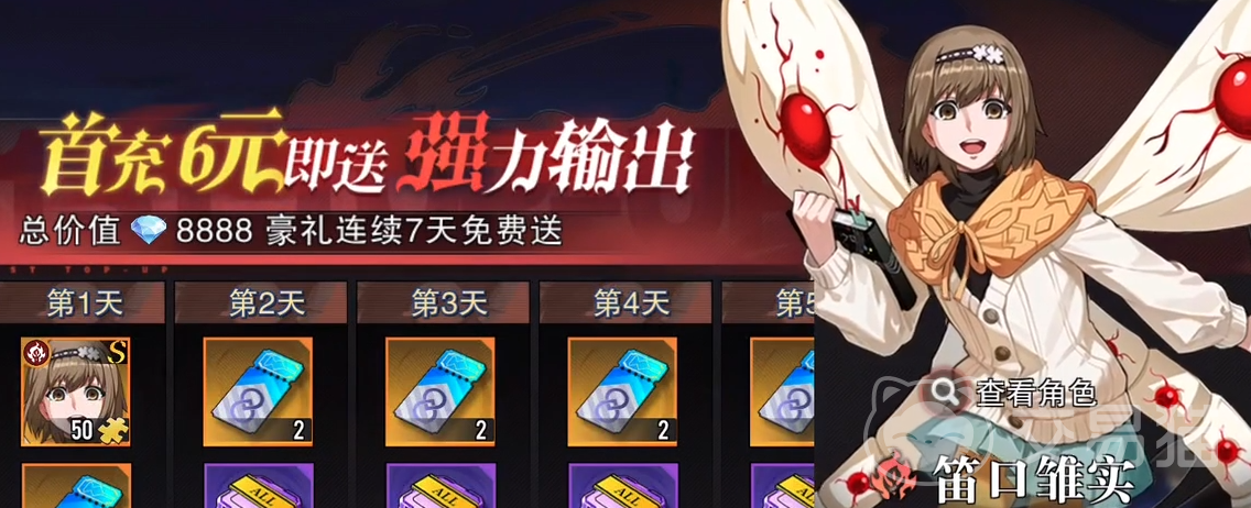 笛口雏实可通过首充活动直接获得,获取门槛较低。完成首充后,系统还将连续数日发放培养资源,涵盖经验材料、升星道具等,便于玩家快速完成角色成型。在实际开荒过程中,该角色承担主要输出职责,对战局推进起到决定性作用。