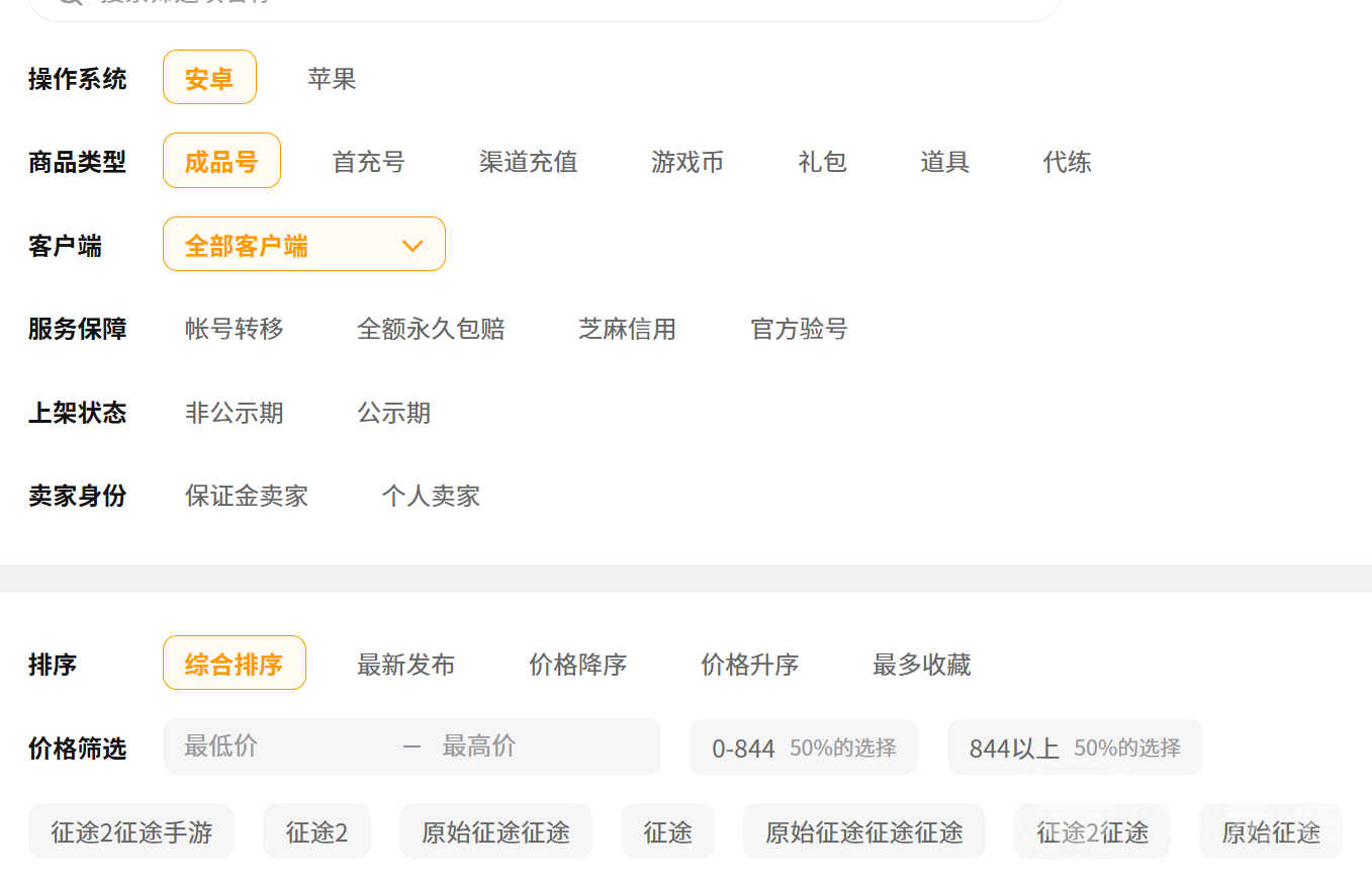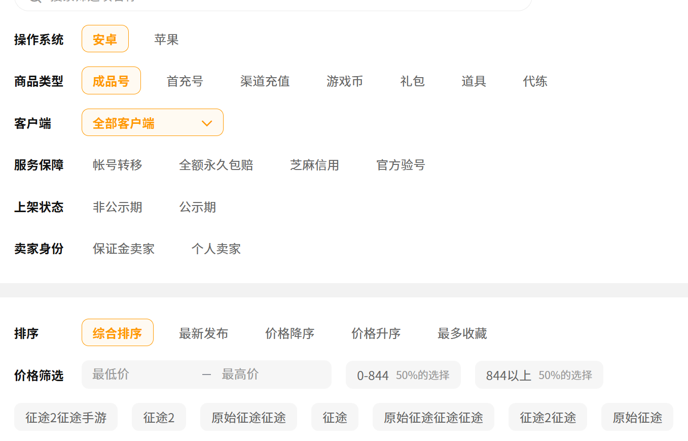 交易猫上的征途2手游账号简直五花八门,应有尽有,因为这里游戏全覆盖,覆盖了6千多款游戏,包括了一百多万在架的商品,不管你是直奔满级爽玩,不想熬新手期的速通党,还是爱囤稀有装备的手机控,在这都能挖到合心意的号。一搜全是账号信息,高等级号直接帮你跳过枯燥升级,秒进后期核心玩法。新区潜力号,老区成品号,平民性价比款,土豪顶配款,啥类型都有,总有符合你口味的账号。玩家们可以通过强大的搜索和筛选功能,根据价格或者想要类型进行精细筛选。