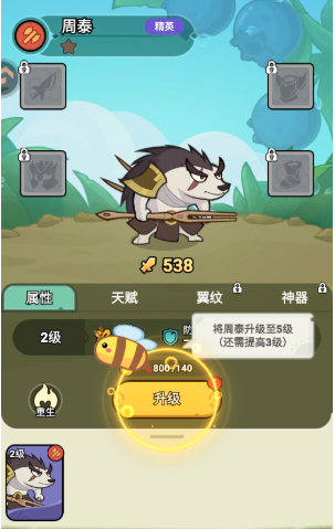 周泰:高抗击打型前排武将,持长枪冲锋在前,背部尖刺造型强化其防御特质。当前等级为2级,基础生命值偏低,但已可硬抗BOSS三次重击,为后排输出争取稳定输出时间。成长路径明确:升至5级后,防御属性将实现显著跃升,配合资源投入可快速构建坚实前排防线。每场胜利所获奖励均可累积用于角色强化,推动整体战力稳步提升。