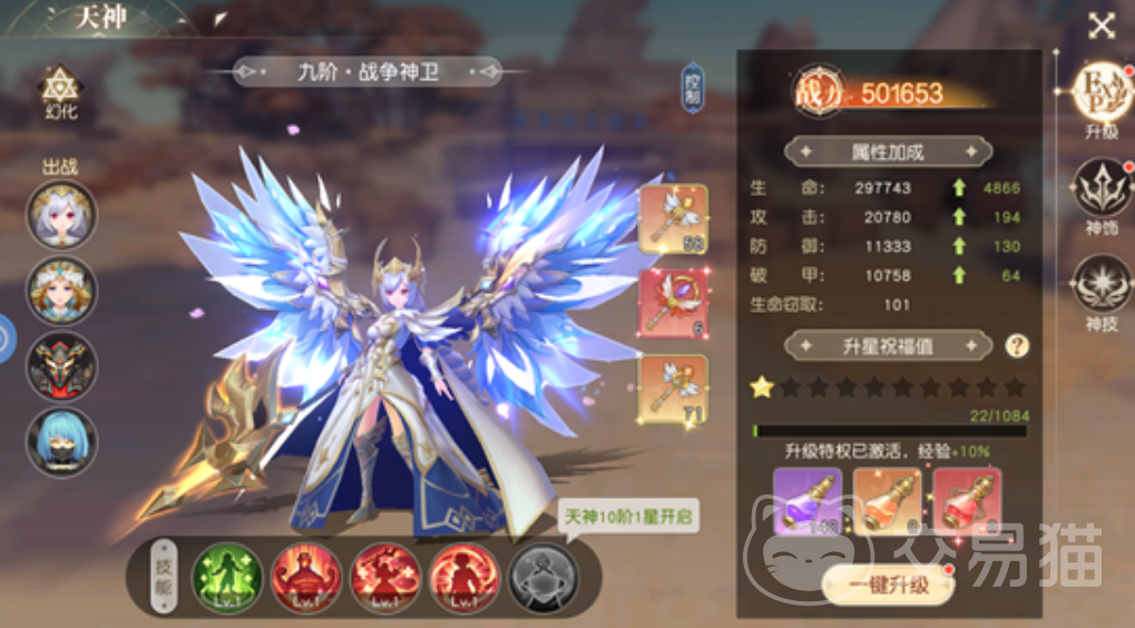 天神系统的成长分为两条主线:一是通过消耗【神力精华】进行等级提升,直接增强基础属性与技能倍率;二是积累【祝福值】完成进阶,每完成一次进阶,不仅属性获得阶梯式增长,所有天神技能效果也会同步强化,形成战力跃迁闭环。