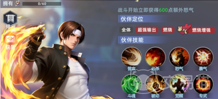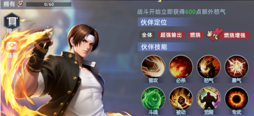 首推阵容以草薙京为战术轴心,主打“异常状态持续压制”体系。其必杀技具备高额单体倍率伤害,并在释放后生成火焰护盾;当敌人攻击该护盾时,自身将被施加“燃烧”状态。更重要的是,草薙京对已处于燃烧状态的目标造成额外伤害加成;其怒气技能则覆盖全体敌方单位,每名目标均附加1层燃烧效果,为后续连锁反应奠定基础。