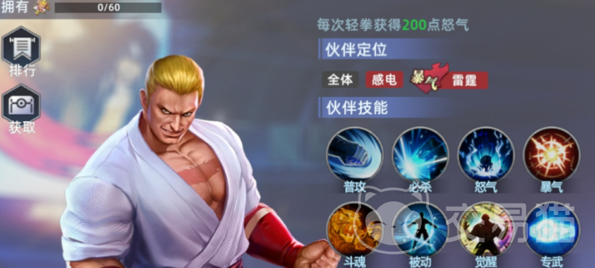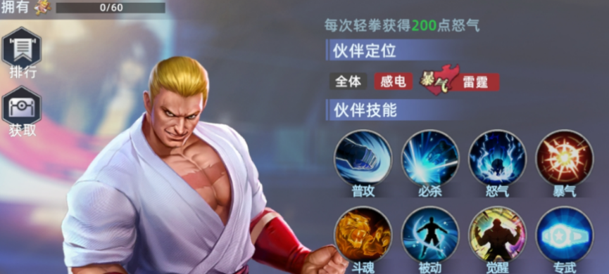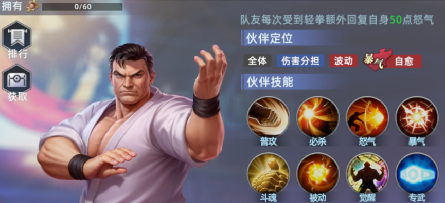 坂崎琢磨承担前排承伤与战术控场双重职责。其必杀技可使指定敌方单位进入完全免伤状态(持续1回合),同时恢复自身一定比例生命值;怒气技为多段锁定打击,于回合结束时对目标追加超然伤害。当生命值低于阈值时,自动触发暴气回血机制;升至2星后解锁“重拳”被动,实现持续自动生命回复。比利则定位为功能性削弱者,其必杀技可降低目标必杀技与怒气技的免伤率,有效放大全队输出效率。