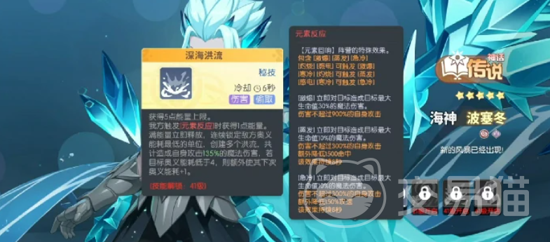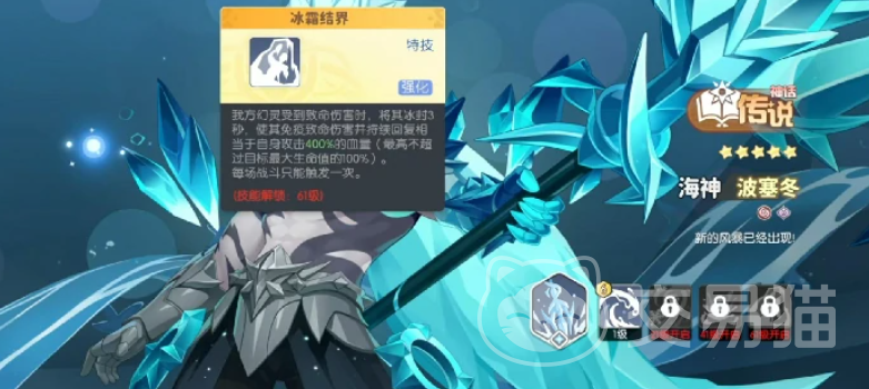 波塞冬共拥有4个主动技能与1个被动技能。其一技能为奥义类范围伤害技,消耗6点能量释放,覆盖半径广、命中率高,虽无增益效果,但在清场与打断关键施法环节中具备稳定功能性;二技能“凛冬将至”为开局即生效的自动触发技,兼具敌方寒冷状态施加与自身位移双重效果,配合被动可实现首回合强压制,显著压缩对手战术启动窗口。