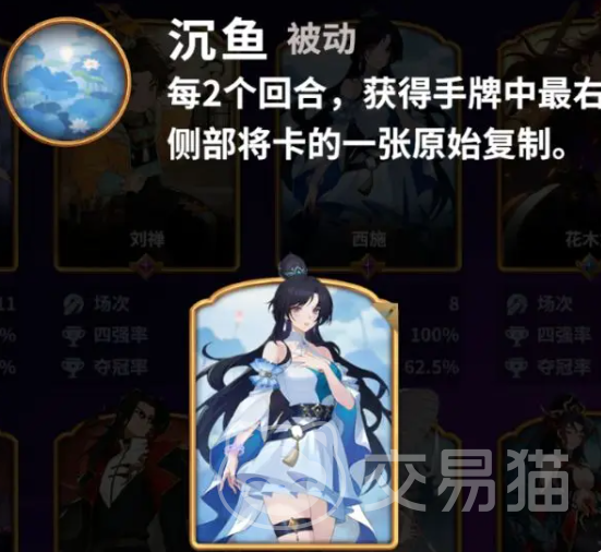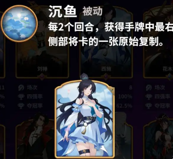 西施的核心被动“沉鱼”具有明确触发规则:每间隔两个回合(即第1、3、5回合等奇数回合),自动获取当前手牌最右侧的一张卡,并生成一张完全相同的复制卡。该效果从首回合即生效,无需前置条件或等级解锁。在标准6回合对局中,若手牌右侧持续出现优质卡牌,理论最高可稳定获得三张五星品质卡牌。相较而言,同梯队武将如曹植需依赖商店等级提升才能逐步解锁关键技能,而初始阶段商店普遍处于低星级状态,导致其成长曲线明显滞后于西施。