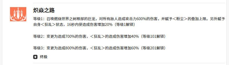 终结技「炽焱之路」拥有全角色顶尖的单体爆发潜力,伤害倍率高达600%。发动时同步激活狂乱状态,持续16秒,期间全伤害提升20%。若妮亚担任队长,其支援效果将在6秒内每2秒触发一次,对生命值最低的敌人施加600%倍率的烧伤伤害,形成精准斩杀与压力压制双重价值。