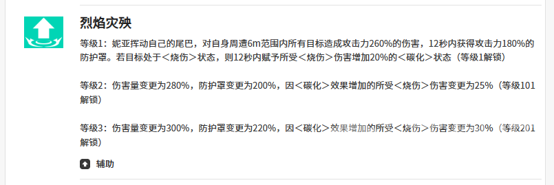防御向技能「烈焰灾殃」作用范围为半径6米,造成260%倍率伤害,并立即生成持续12秒、数值达180%攻击力的护盾。若命中目标已附带烧伤状态,则妮亚可在12秒内对该目标额外施加碳化效果,使后续所有烧伤类伤害提升20%,大幅强化DOT链式反应。