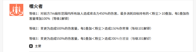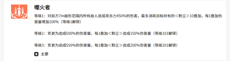 主动起手技「噬火者」为扇形范围攻击,作用半径约7米,基础伤害为40%。其关键机制在于粉尘联动:每存在1层粉尘,该技能伤害提升100%,四层粉尘即实现400%增幅;技能升级后,满级效果可将单次伤害推高至550%倍率,成为高频清场与破盾首选。