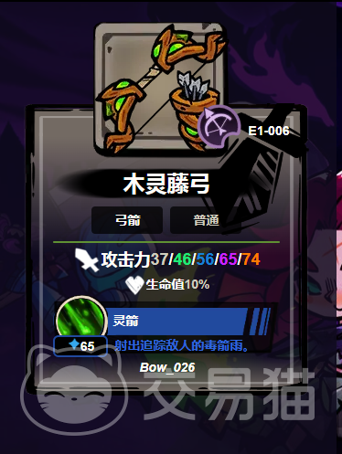 木灵藤弓:通体缠绕鲜活翠绿藤蔓,视觉上富有自然生命力。基础攻击力为37点,并附加10%最大生命值加成,显著增强角色持续作战容错率。其主动技能“灵箭”具备自动索敌功能,箭矢离弦后可动态追踪移动目标,对高机动性敌人(如蝙蝠、狼人)具备稳定命中能力;命中后附加持续毒素伤害,进一步扩大输出窗口,契合丛林系生存流或持续压制型配装思路。