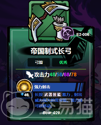 帝国制式长弓:面向中后期挑战设计的高阶远程装备,初始攻击力达48点,为当前弓系最高基础面板。搭载“强力射击”蓄力机制——长按攻击键可积聚金色能量,松手释放后射出高贯穿箭矢,可直线穿透多个单位,对后排脆皮目标(如法师)构成直接威胁。该特性使其在Boss战中尤为关键,既能维持安全输出距离,又可在关键阶段打出集中爆发伤害,是攻坚重型副本的核心配置之一。
