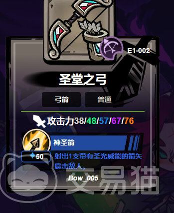 圣堂之弓:银白与赤红双色交缠的仪式感造型,基础攻击力提升至38点。核心技能“神圣箭”赋予箭矢额外圣光属性伤害,对亡灵单位存在显著克制效果;同时具备穿透后爆炸机制——箭矢命中首个目标后,将在落点处触发小范围溅射伤害,有效压制前排重甲单位(如骑士)及具有腐蚀抗性的精英怪,实现单点突破与群体压制的双重作用。
