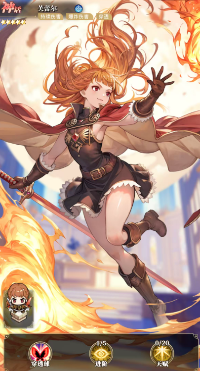 芙蕾尔:持续燃烧型爆发角色,主打“点燃”状态叠加与连锁爆炸。所有穿透伤害均可附加点燃效果,每层点燃在10秒内造成400%倍率的持续伤害,最多叠加40层。五阶进阶后,弹球伤害提升60%,发射数量+2;当被点燃目标死亡时,将引发范围爆炸,每层点燃额外对周围敌人造成40%爆炸伤害;终期点燃总伤增幅可达200%,形成兼具AOE压制与单点斩杀能力的复合输出体系。