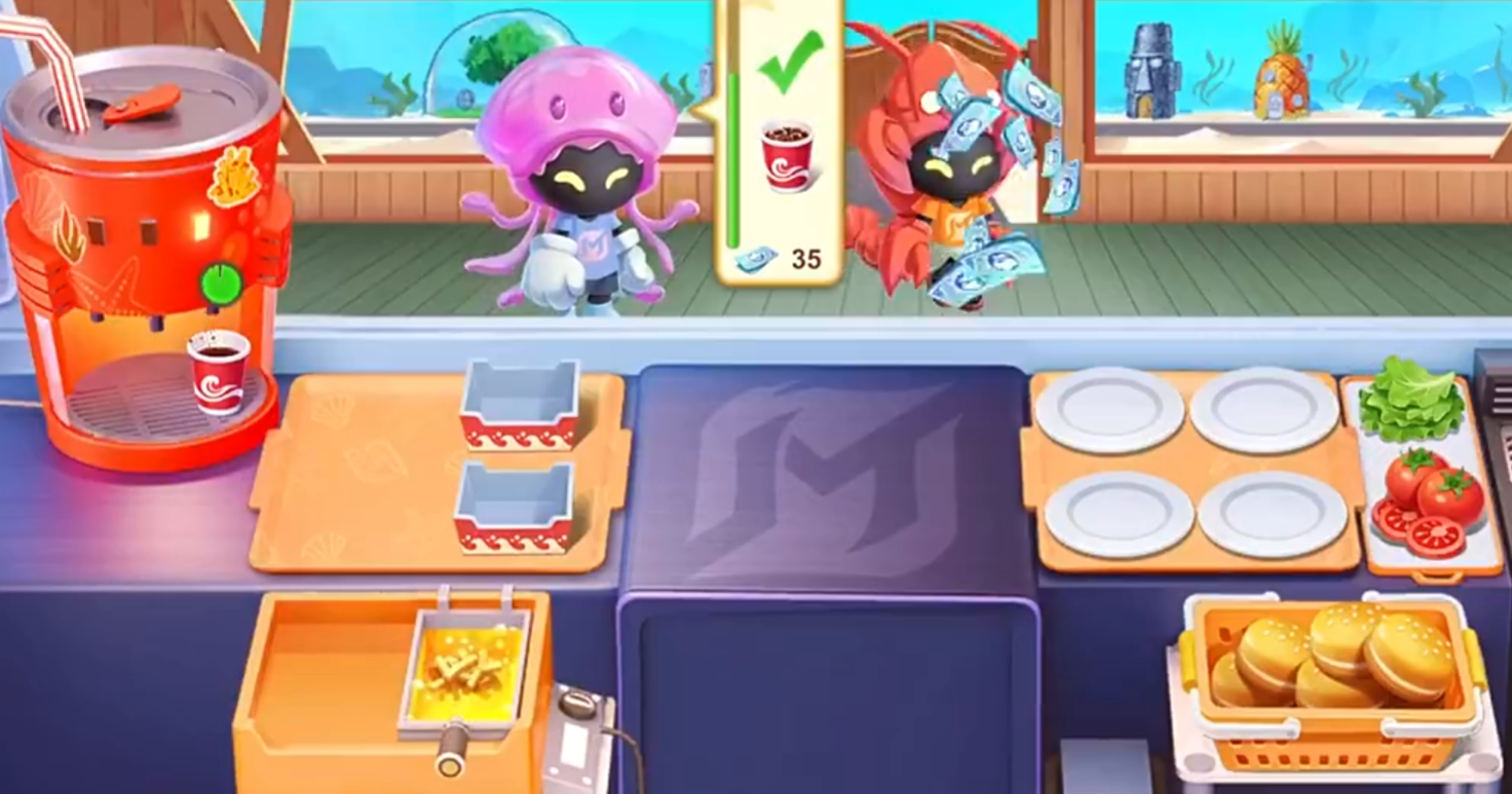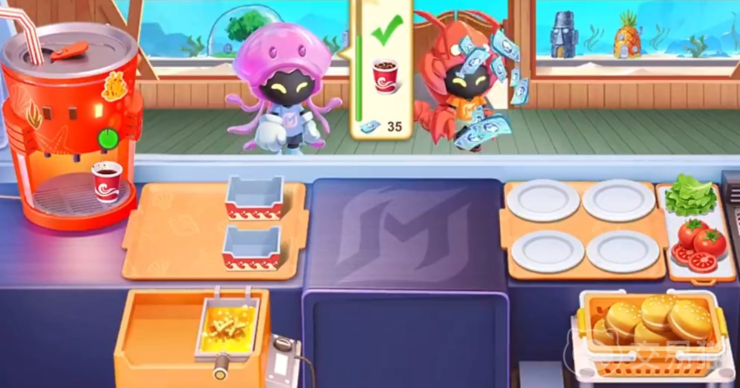 “海底餐厅”是本次周年版本的核心玩法之一。玩家需先通过日常任务获取“游玩卷”,消耗后即可进入模拟经营环节。制作流程清晰直观:依次完成汉堡肉煎制、生菜与番茄铺放、最后加盖汉堡胚,即可合成标志性的蟹黄堡。整个操作节奏明快,适配移动端轻度交互逻辑。