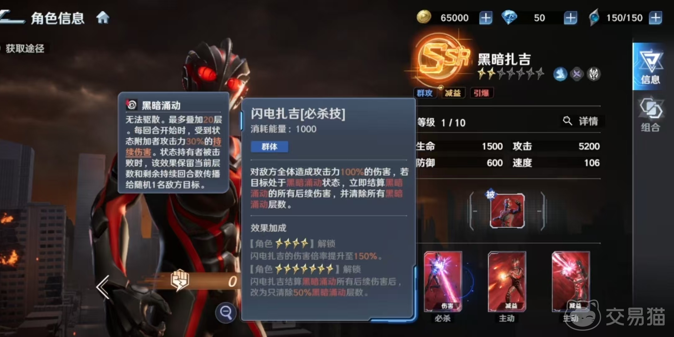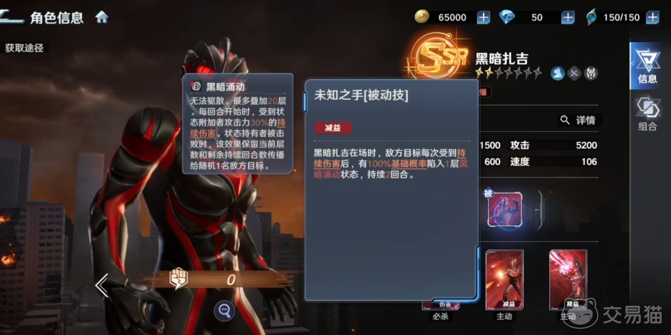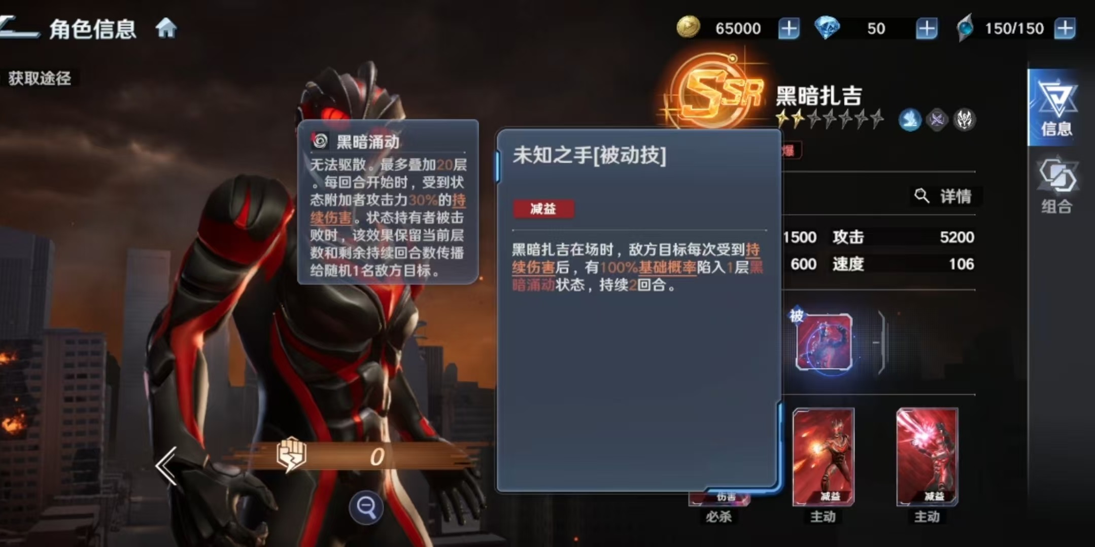 其被动技【未知之手】为整套体系的核心驱动:当黑暗扎吉在场时,敌方单位每承受一次持续伤害,均有概率叠加一层“黑暗涌动”状态。该状态上限为20层,不可被净化或清除;每回合开始时,持有者将额外承受相当于施加者30%攻击力的持续伤害。若目标在携带该状态期间被击败,则当前层数与剩余持续回合数将完整保留,并随机转移至一名敌方单位。