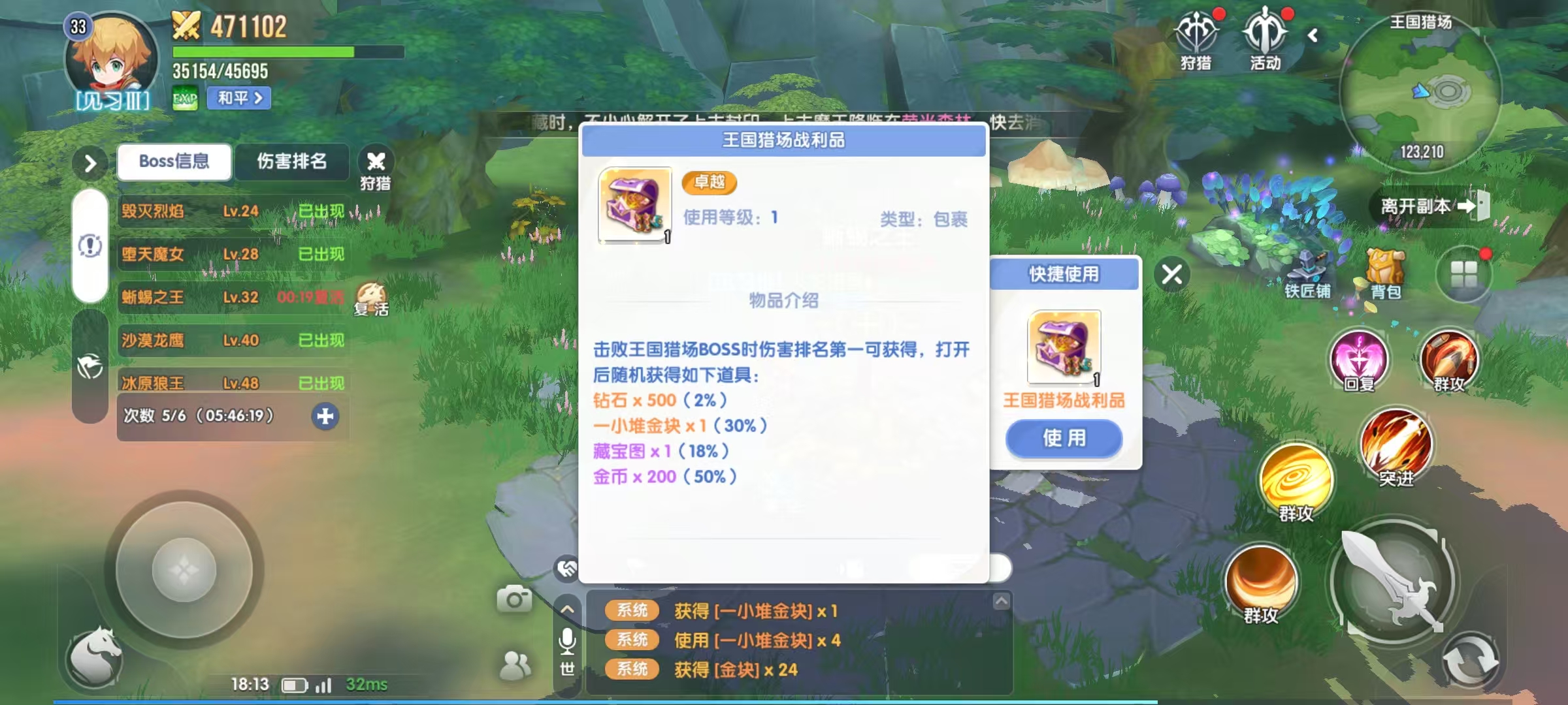王国猎场为等级解锁式日常活动,需角色达到主线指定等级后方可激活。该玩法本质为限时多人协作Boss挑战系统,核心目标是通过累计伤害量角逐全服排名,从而获取稀有资源与专属奖励。单场战斗时长紧凑,平均耗时约2–3分钟,适配通勤、午休等碎片化时段。活动周期固定开放,每日可稳定参与,是提升战力的关键材料来源之一。