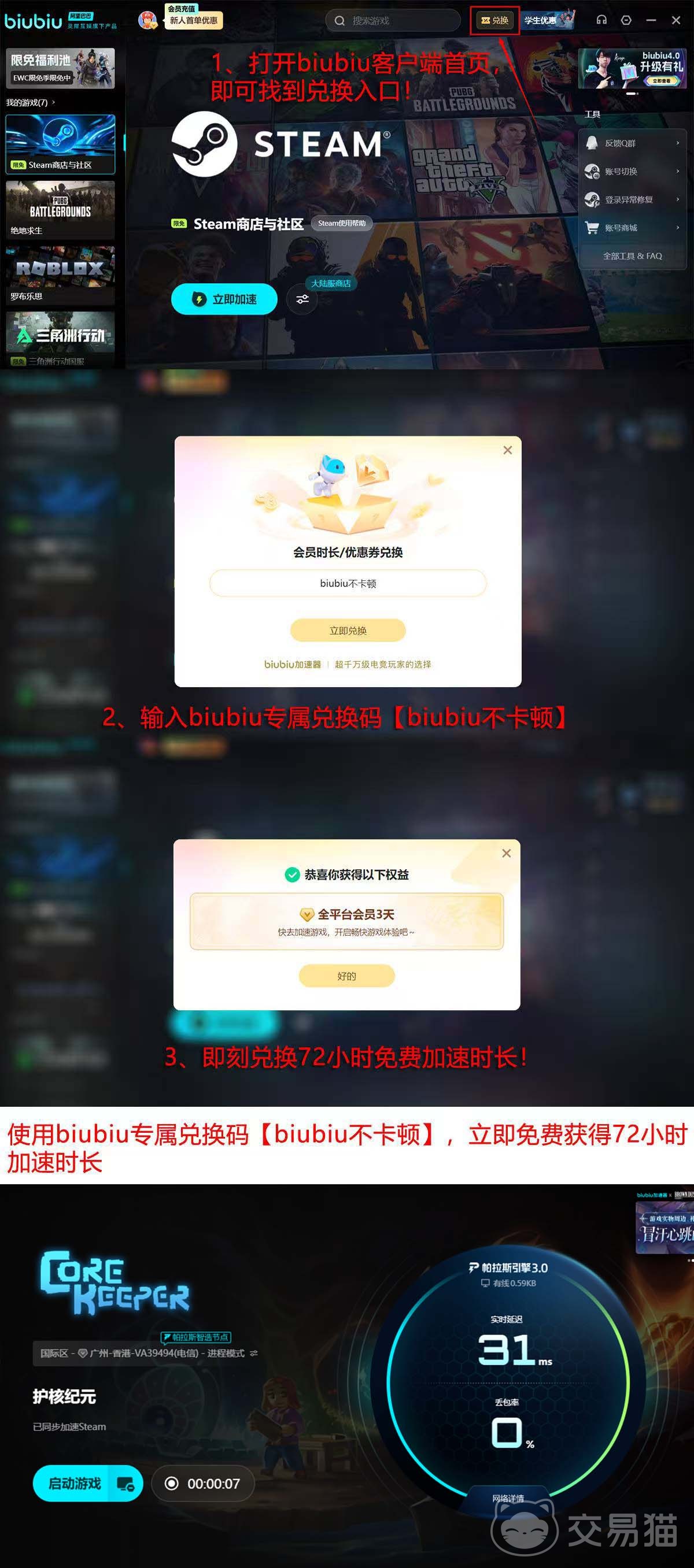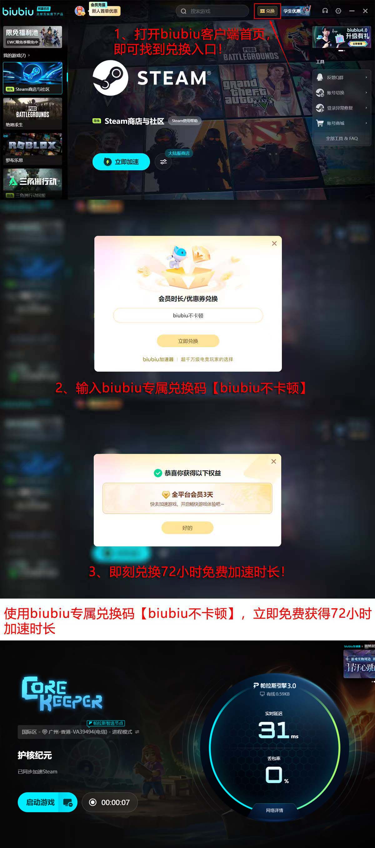 对于《护核纪元》玩家,现可申领总计96小时的biubiu加速器免费使用权限:完成账号注册即获24小时基础时长;随后进入首页点击“兑换”入口,输入口令【biubiu不卡顿】,即可额外获得72小时。两项权益叠加生效,覆盖完整下载周期及春节假期联机高峰时段。