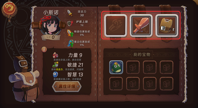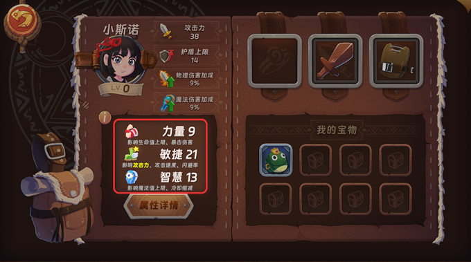 进入旅馆大厅后,玩家即可接触完整的角色成长路径。所有可操作角色均支持通过武器、法术、宝物三大系统进行能力强化。其核心属性统一划分为敏捷、力量、智慧三类,每名角色仅能选定其中一项作为主属性——该属性将获得最高倍率的攻击力加成,直接决定角色输出风格与后期成型方向。以小斯诺为例,若将其主属性设定为敏捷,不仅可提升攻击速度与闪避率的百分比数值,还将同步增强基础攻击效果,形成高速高频的战斗节奏。