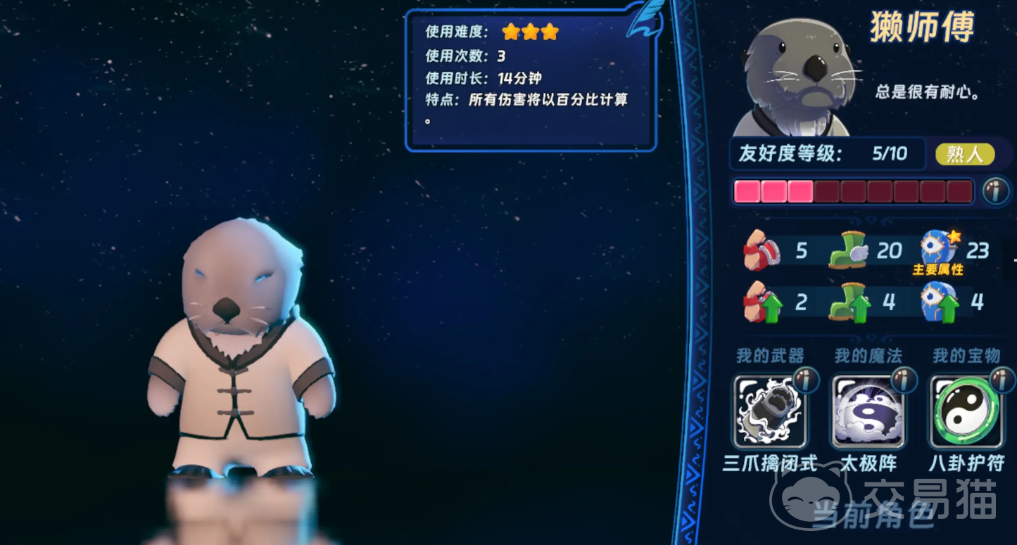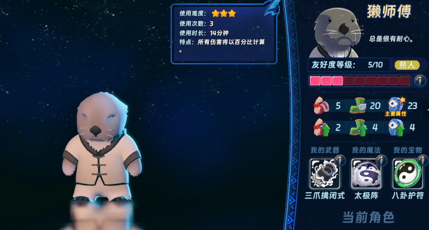 第二位是獭大师。其外观为拟人化水獭形象,核心机制围绕“阴阳劲”双状态系统展开:受击时叠加阴劲,提供减伤效果;闪避成功则积累阳劲,提升攻击速度。两种状态可独立叠加并共存,形成动态防御与输出节奏。在移动中持续按住普攻键,可触发贴身连击动作,显著提升近距压制力。此外,该角色清除障碍物的效率优于多数同类型单位,且攻击距离随技能等级成长而扩展,适用于需要灵活走位与高频输出的关卡场景。