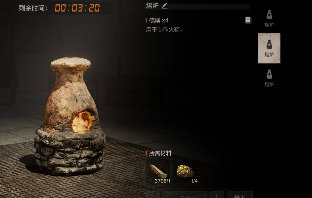 完成基础装备配置后,进入发育关键期。熊类生物是油脂核心来源,而油脂为熔炉建造必需材料;击杀后务必采集其肉质投喂坐骑,维持马匹生命值与奔跑耐力。返回据点后立即搭建熔炉,随即开展矿石采集——矿石是后期高级装备合成的刚性资源,持续稳定的矿产积累直接决定中后期战力上限。