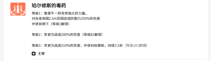 核心输出技【珀尔修斯的毒药】将防御力直接转化为范围伤害:对半径2.5米内所有敌人造成等同于自身防御力250%的物理伤害,并附带概率触发“倒下”状态。该效果形成显著正向循环——角色防御越高,单次伤害基数越强;而敌人倒地后,不仅丧失行动能力,更会为后续技能衔接创造稳定窗口。