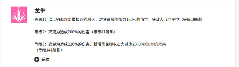 主动控场技【龙拳】以高段位上勾拳发动,造成相当于自身防御力180%的伤害,并有几率击飞目标。命中后还将削弱敌人20%攻击力,持续影响其输出效率。其被动【不屈不挠的意志】则在生存临界点触发:当克罗伊生命值低于35%且正受集火时,立即获得40%物理抗性与40%魔法抗性加成,并恢复7%最大生命值及一定能量。该效果每场战斗仅可生效一次,但关键节点的容错率提升极为显著。