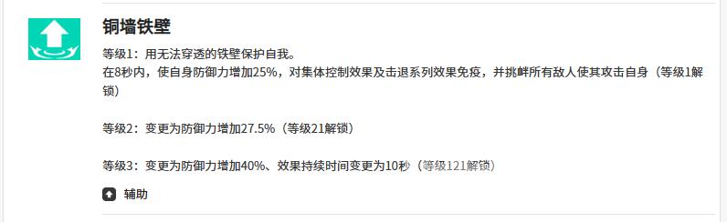 防御专精技【铜墙铁壁】提供双重保障:每8秒自动激活,提升自身25%防御力;同时完全免疫气体类击退效果。在此状态下,克罗伊可主动发动嘲讽,强制吸引范围内敌方单位集火自身,实现精准承伤与火力分流,是构筑坦克阵型的核心锚点。