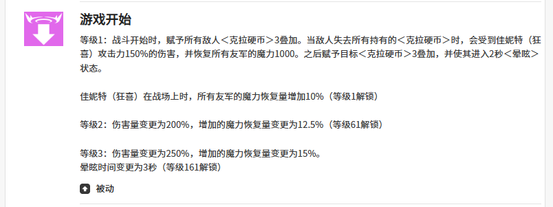 被动技能【游戏开始时】赋予佳妮特先手压制力:战斗初始即强化敌人身上克拉硬币的叠加效率;当敌人失去克拉硬币状态时,立即对其造成佳妮特攻击力150%的伤害,并为全体友军恢复1000点魔力;在角色等级或装备达到一定条件后,该伤害还将附带2秒眩晕效果,显著提升控场节奏。