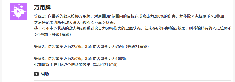 二技能【万用牌】具备范围压制与状态触发双重功能。佳妮特向最近敌人投掷卡牌,对半径3米内所有目标造成200%攻击力的伤害;若目标已存在克拉硬币,则额外施加“不幸”状态——处于该状态的敌人每2秒承受相当于佳妮特攻击力50%的真实伤害。连续施放此技能还将激活出血效果;若目标未能在6秒内清除出血,则直接削减一层克拉硬币叠加层数,形成反制闭环。