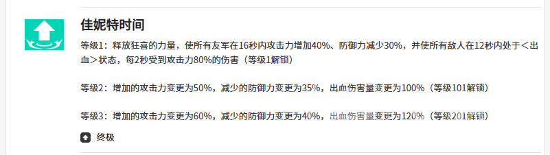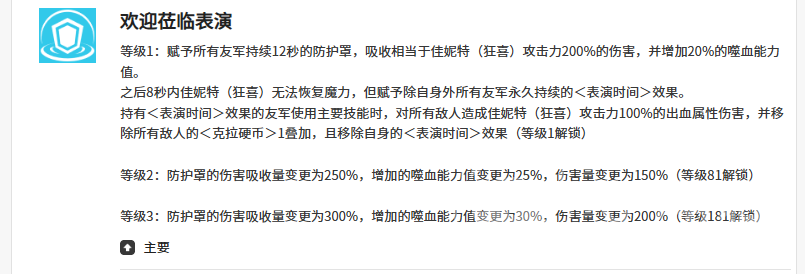 一技能【欢迎莅临表演】是佳妮特团队支援的基石。释放后,为全体友方单位施加持续12秒的防护罩,吸收相当于佳妮特自身攻击力200%的伤害;同时提升全队嗜血属性。防护期结束后,除佳妮特自身外,所有队友将永久获得“表演时间”状态——该状态下,队友每次释放主动技能,均可对目标造成等同于自身攻击力100%的额外伤害,并依据当前出血层数进一步强化输出。值得注意的是,当队友拥有克拉硬币状态时,可主动移除佳妮特身上的“表演时间”,实现状态资源的灵活再分配。