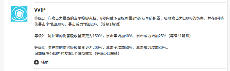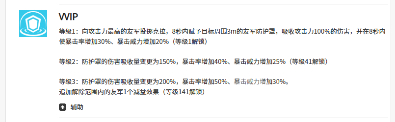 三技能【VVIP】专注定向防护。佳妮特选定我方攻击力最高的队友,为其及周围3米内所有友军施加持续8秒的护盾,吸收量为佳妮特攻击力100%;若护盾受击时触发暴击,则吸收量额外提升20%。该技能对站位协同要求较高——佳妮特需保持与主力输出的合理距离,才能确保护盾覆盖全部关键单位。